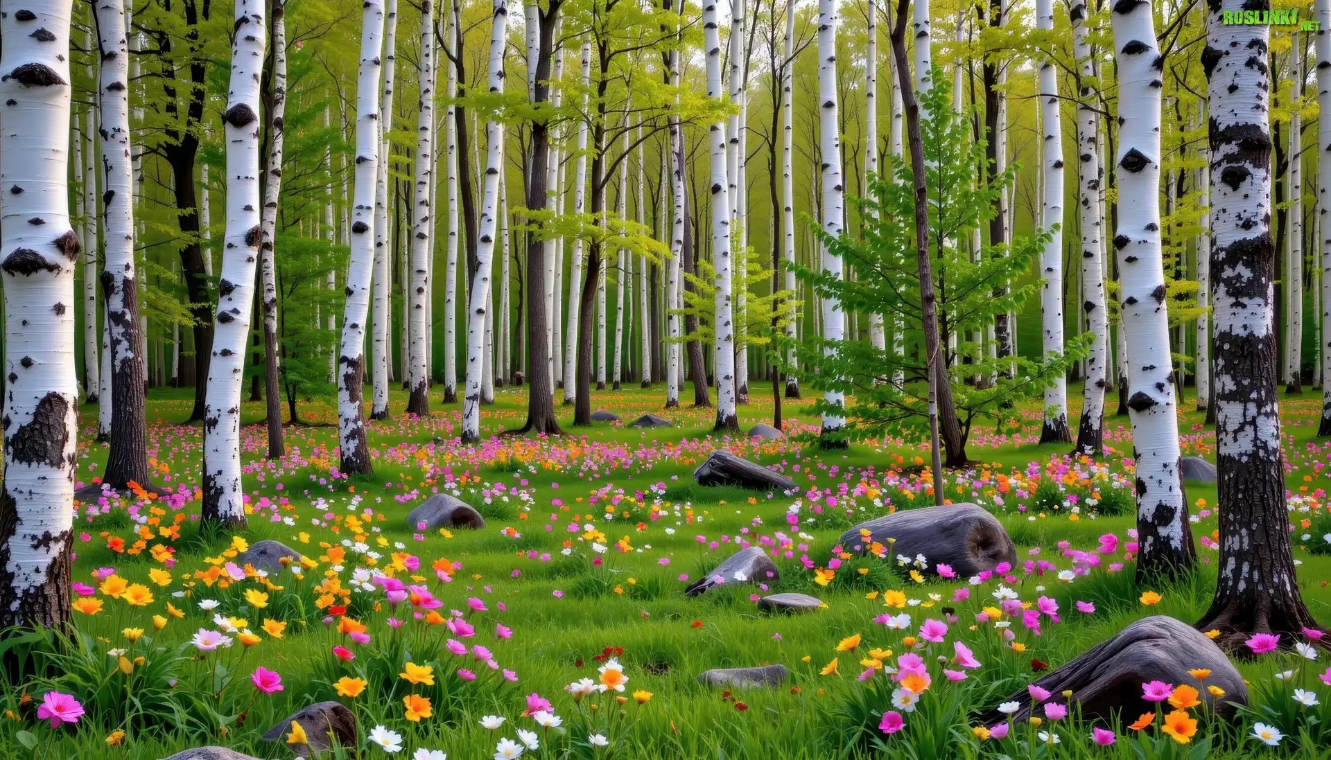 Rośliny: Drzewa, Brzozy, Las, Kwiaty, Trawa, Kamienie