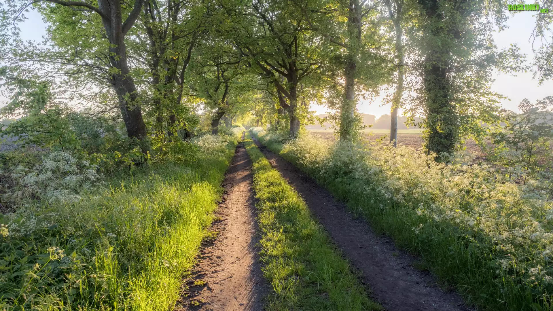 Rośliny: Droga, Drzewa, Trawa, Kwiaty, Poranek, Lato