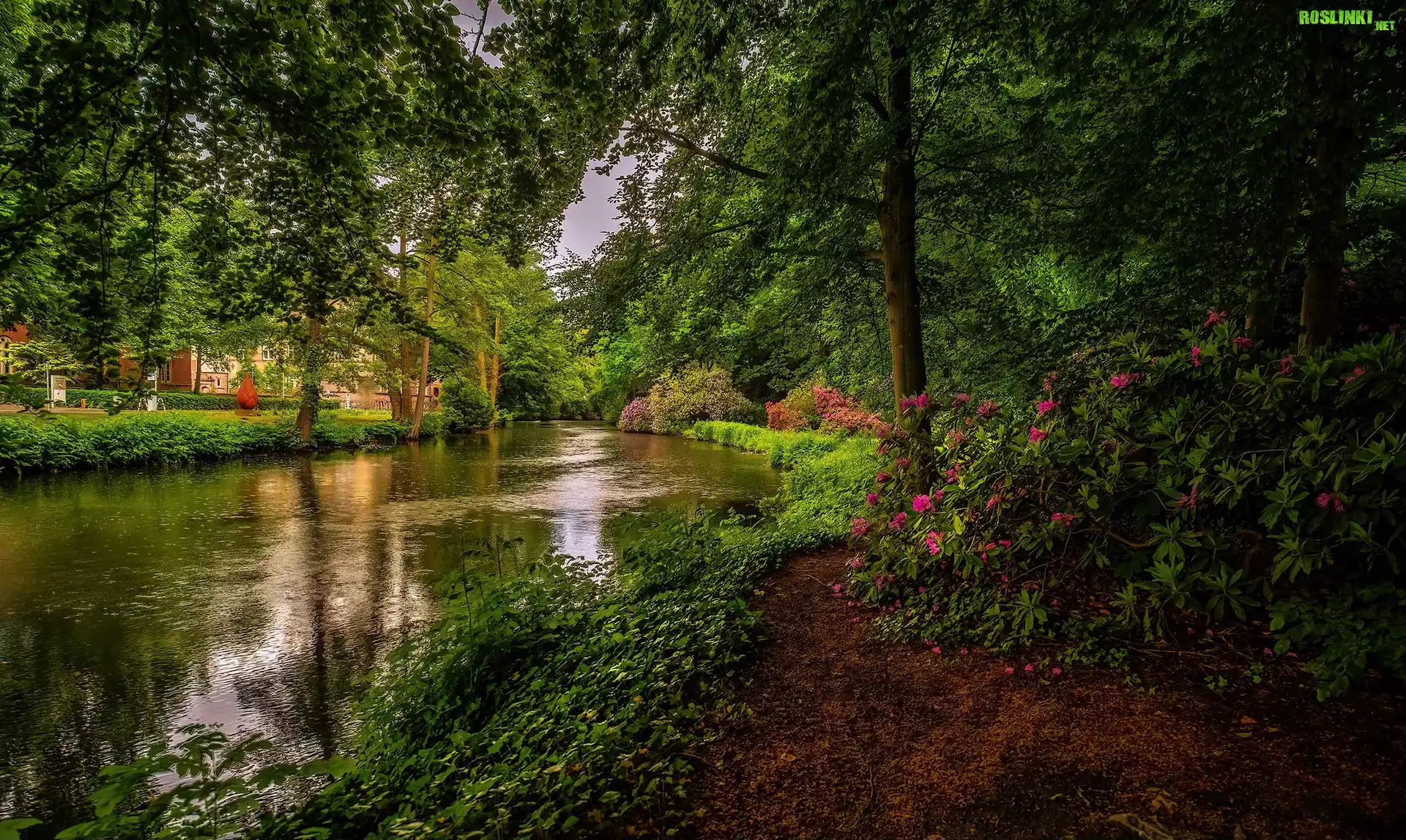 Rośliny: Rzeka, Drzewa, Ścieżka, Kwiaty, Różowe, Rododendrony, Roślinność