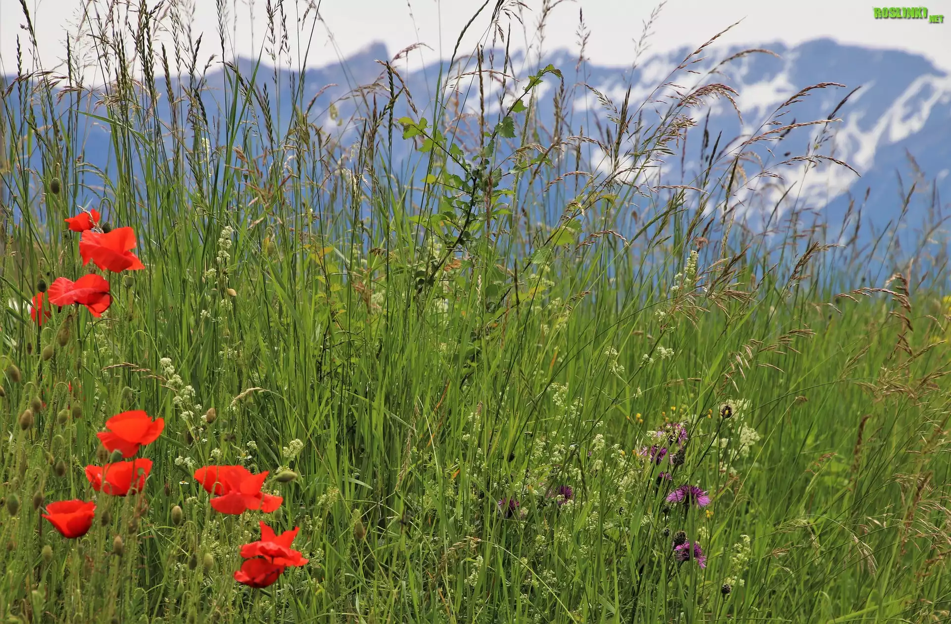 Rośliny: Kwiaty, Czerwone, Maki, Trawa, Góry