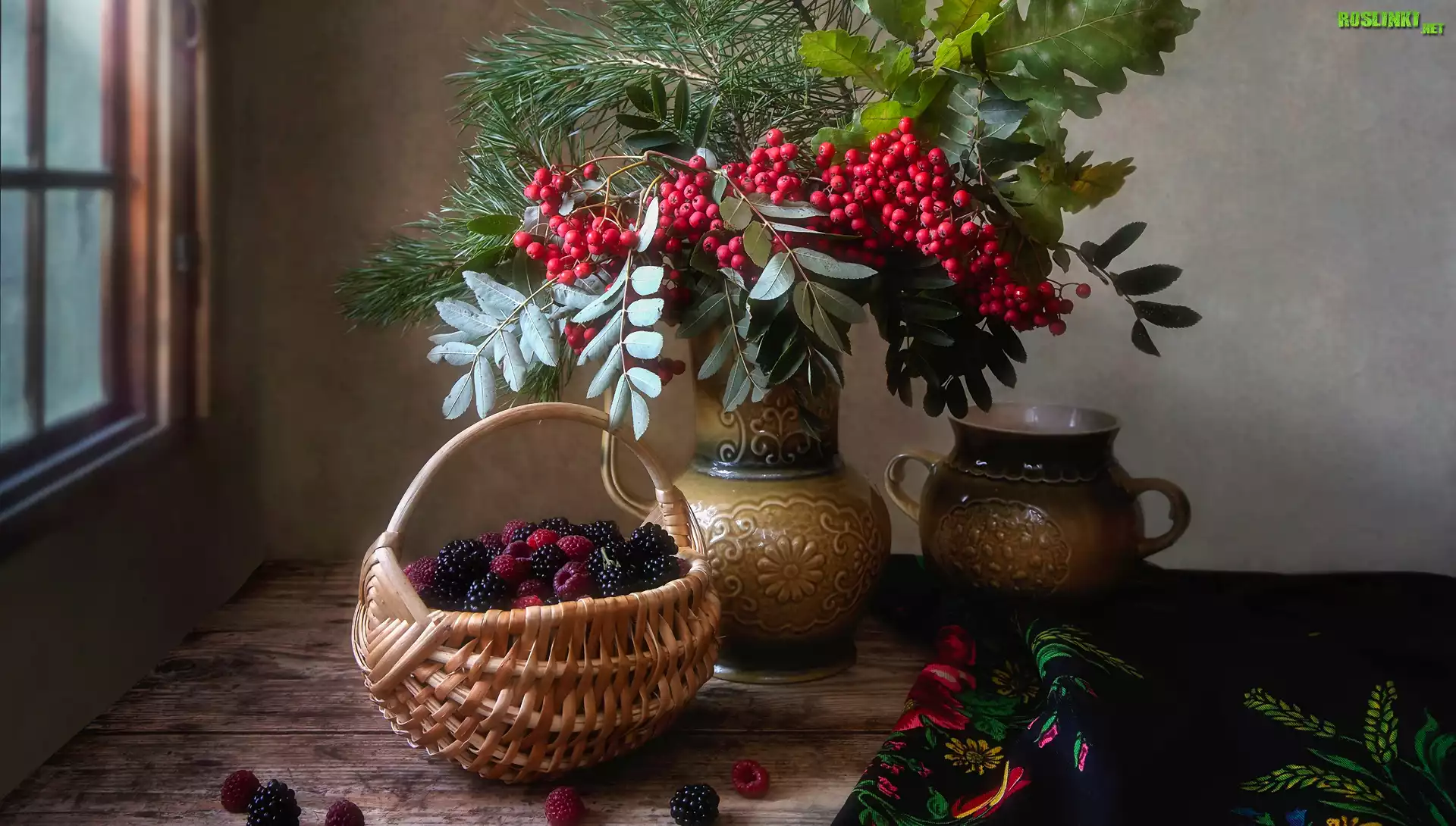 Rośliny: Wazon, Kwiaty, Jarzębina, Koszyk, Maliny, Jeżyny, Kompozycja