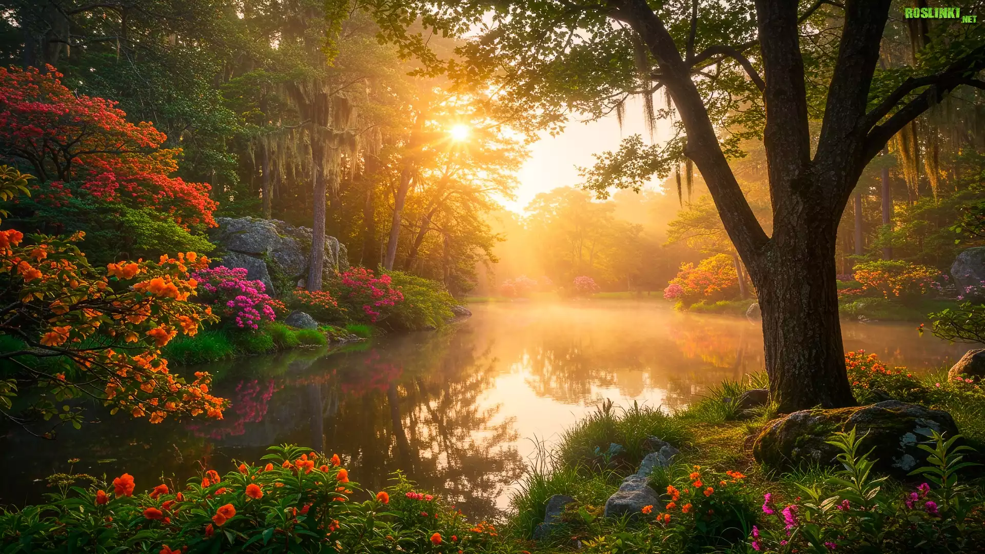 Rośliny: Kwiaty, Krzewy, Drzewa, Rzeka, Słoneczny blask, Wiosna, Zachód słońca