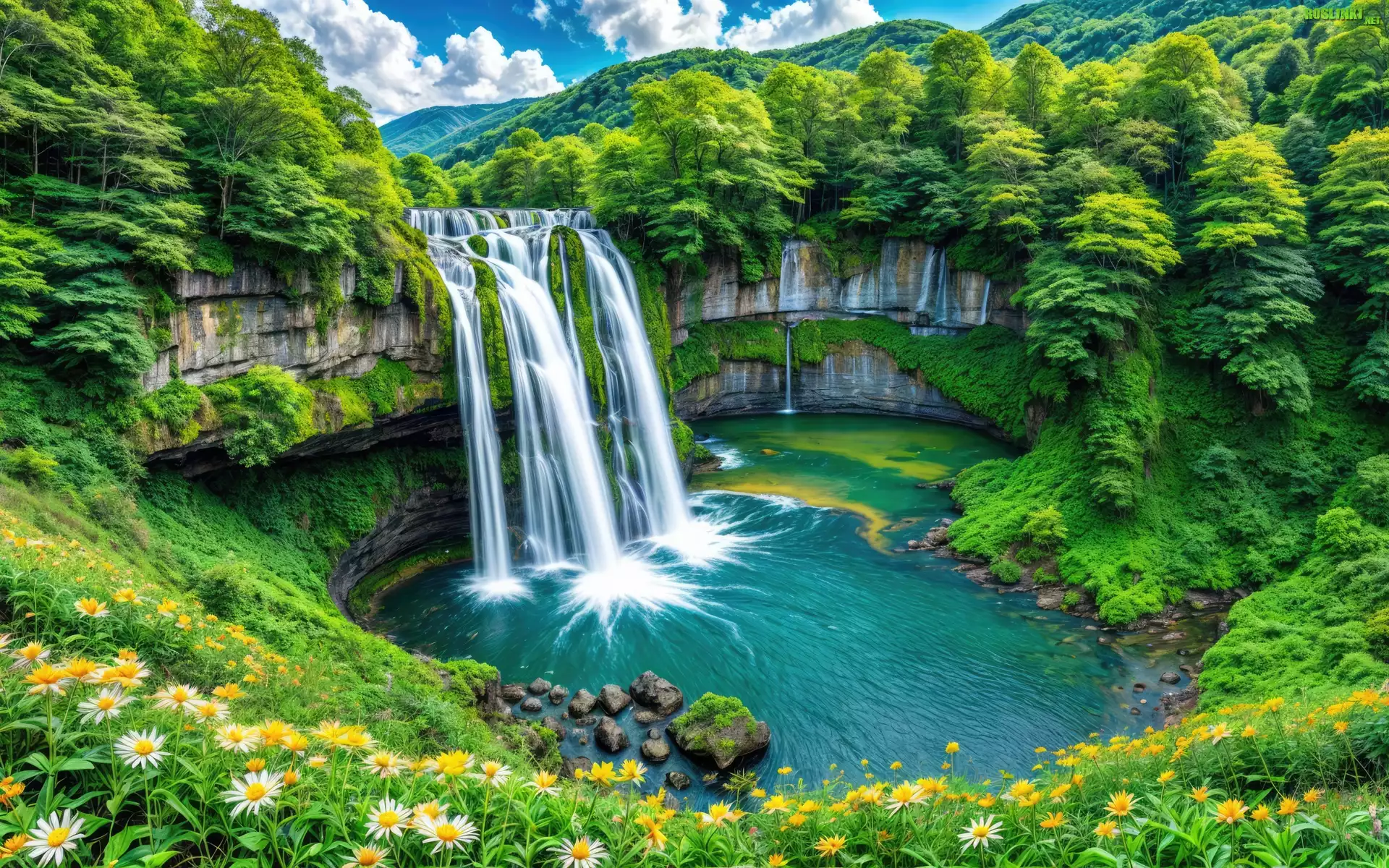 Rośliny: Wodospad, Skały, Drzewa, Kwiaty