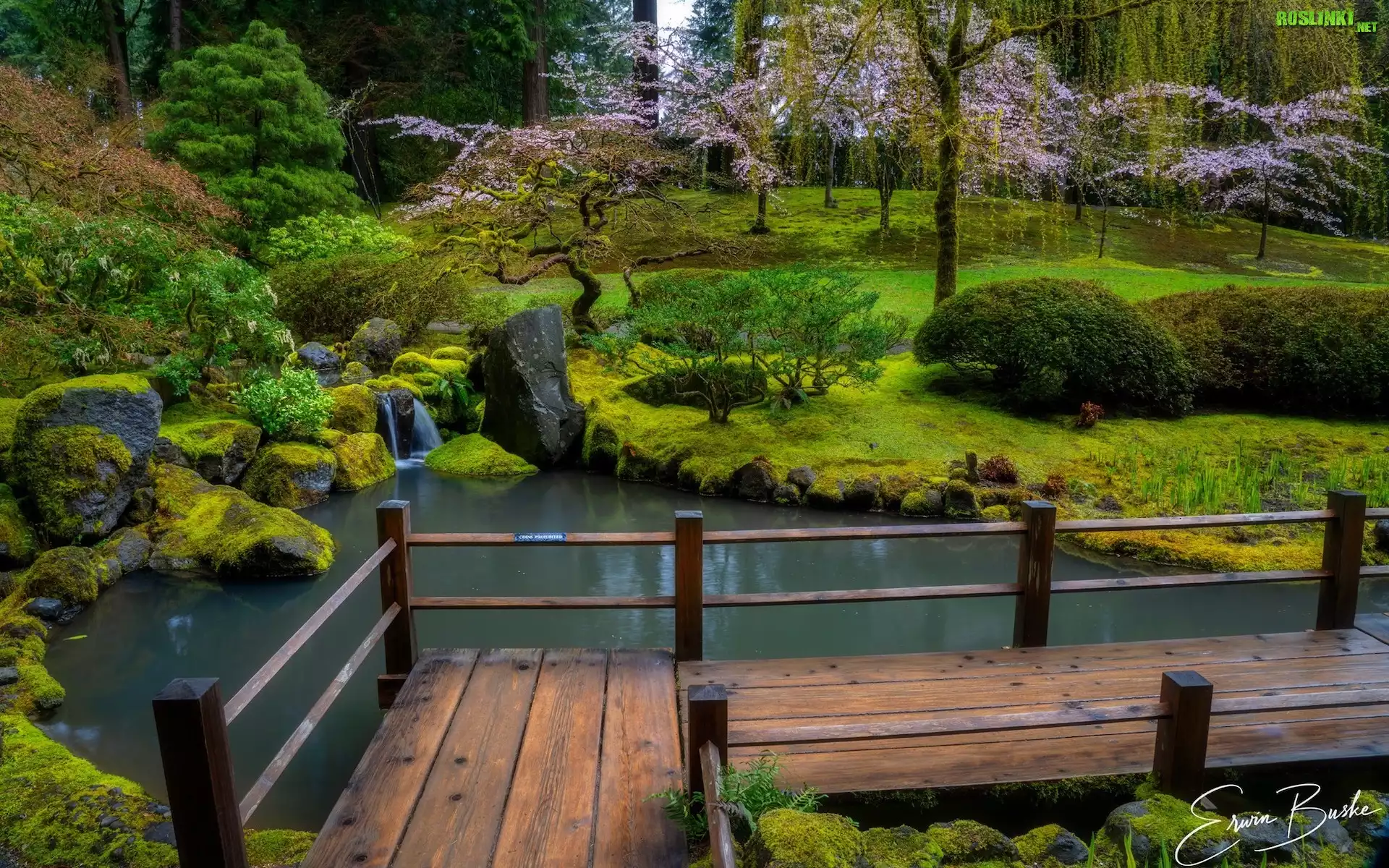 Rośliny: Stany Zjednoczone, Oregon, Portland, Ogród japoński, Kwitnące, Drzewa, Roślinność, Sadzawka, Pomost