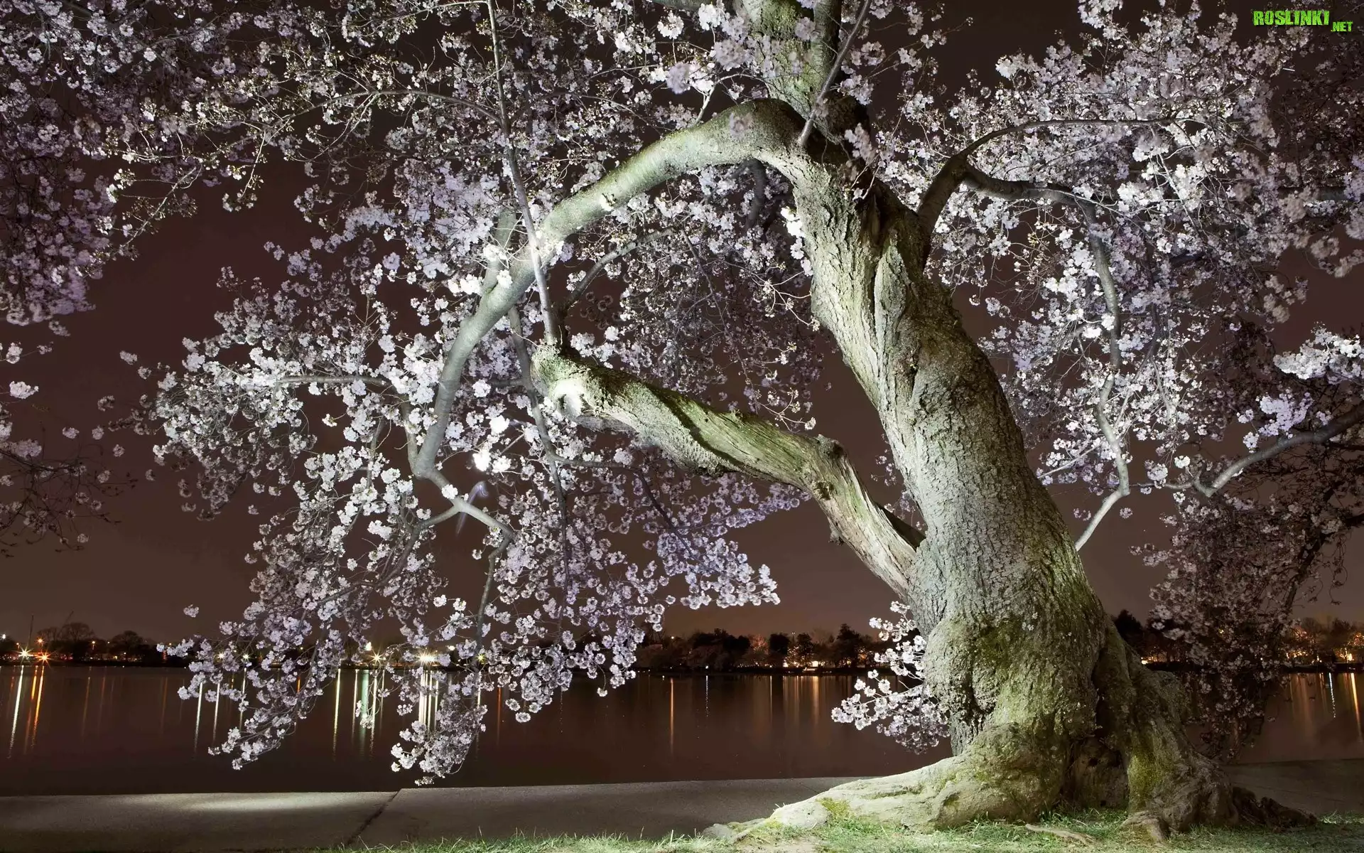 Rośliny: Kwitnące, Drzewo, Rzeka, Panorama, Miasta, Zmrok