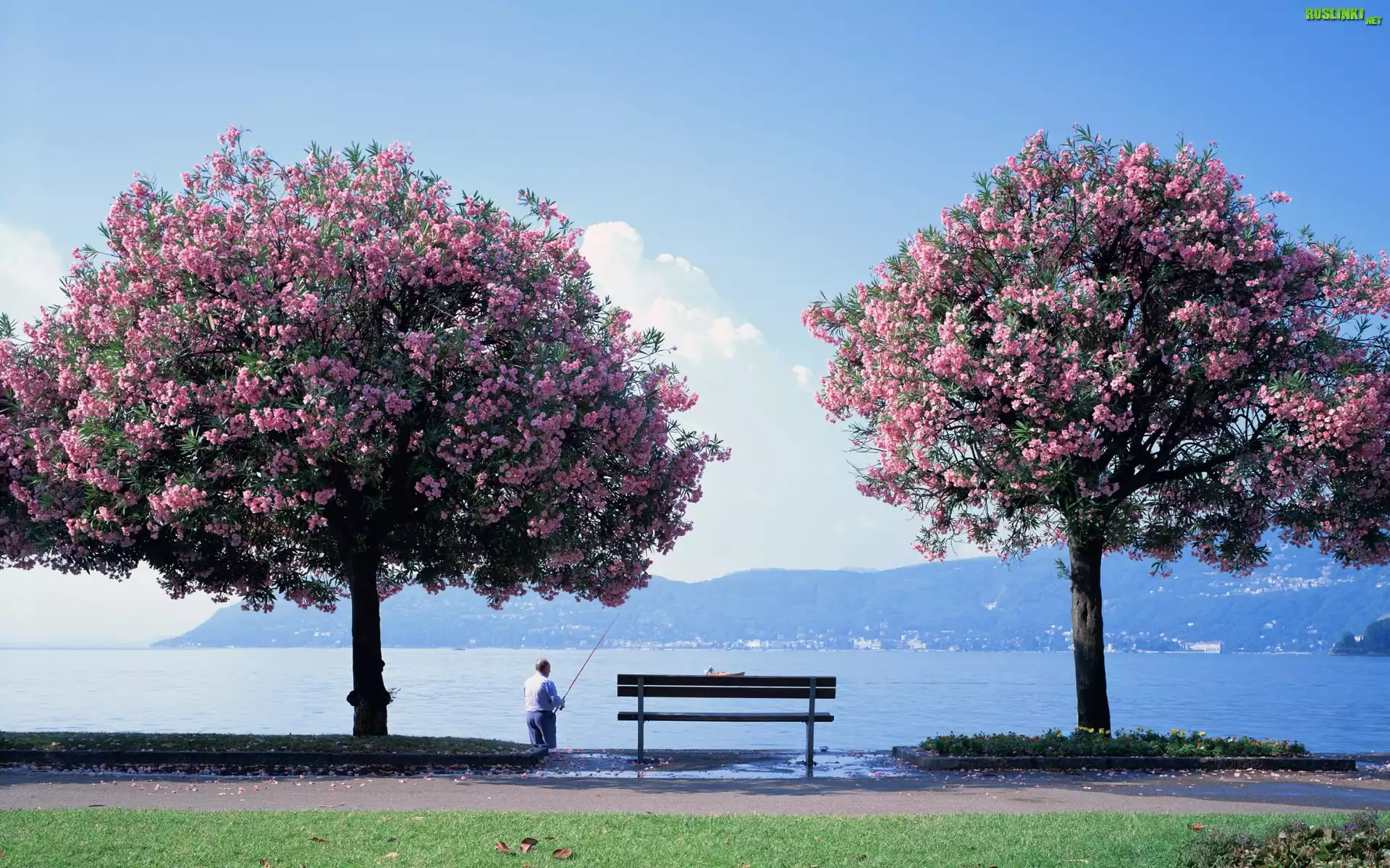 Rośliny: Kwitnące, Drzewa, Jezioro, Góry, Wędkarz, Wiosna