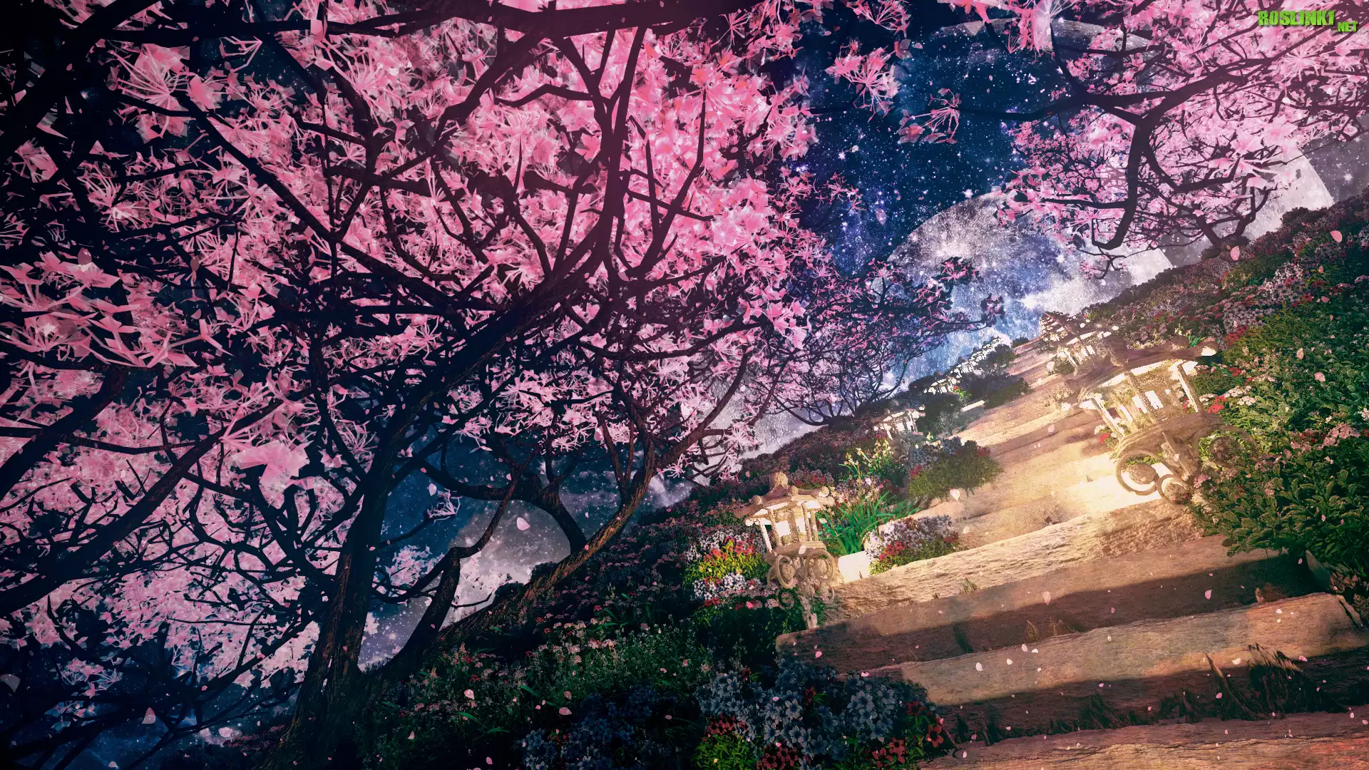 Rośliny: Kwitnący, Ogród, Drzewa, Schody, Grafika