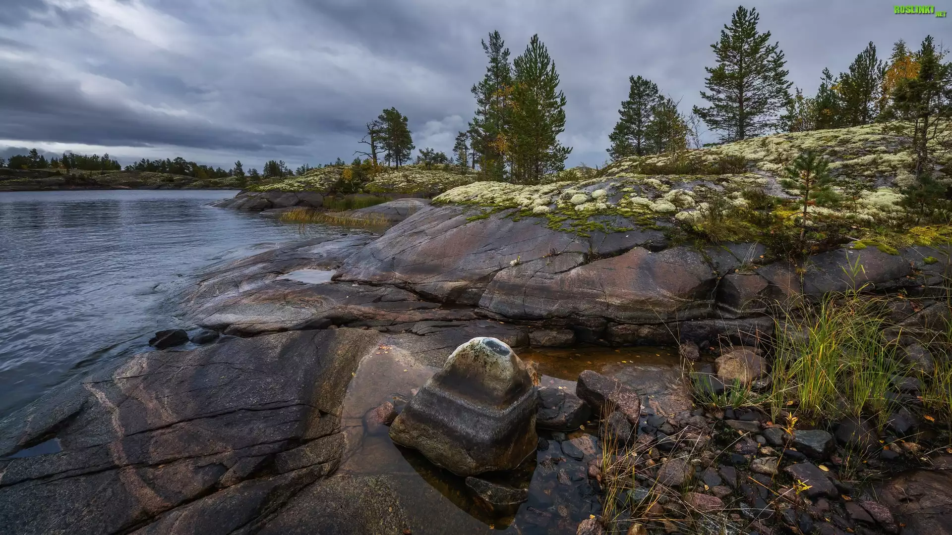 Rośliny: Rosja, Karelia, Jezioro Ładoga, Skały, Drzewa, Chmury