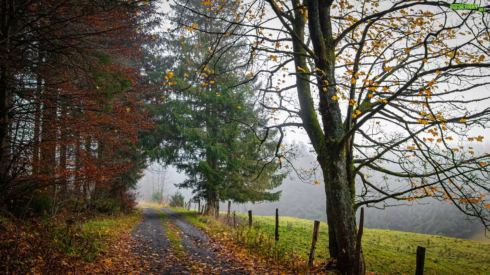 Rośliny: Droga, Drzewa, Mgła, Łąka