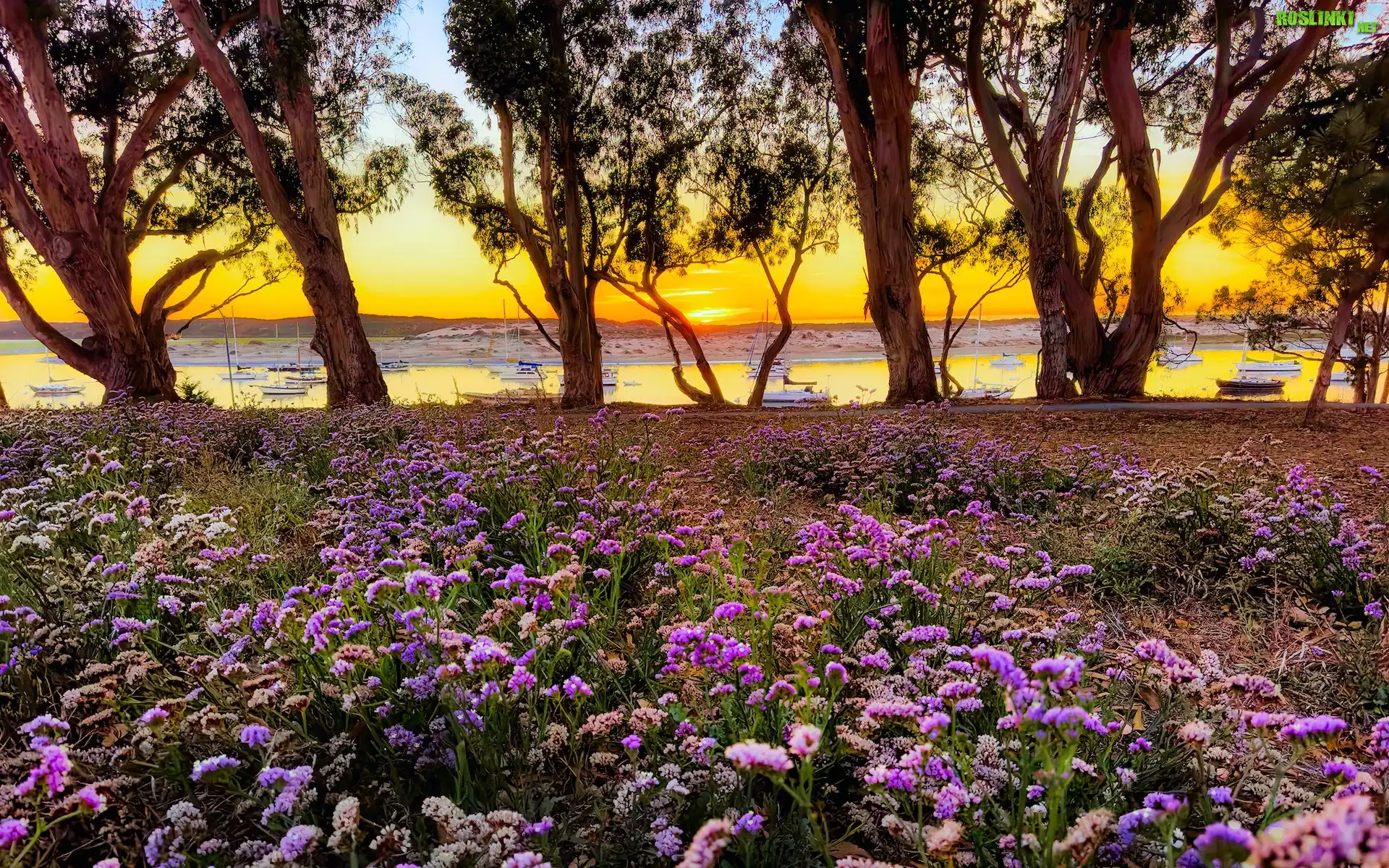 Rośliny: Jezioro, Zachód słońca, Łąka, Kwiaty, Drzewa