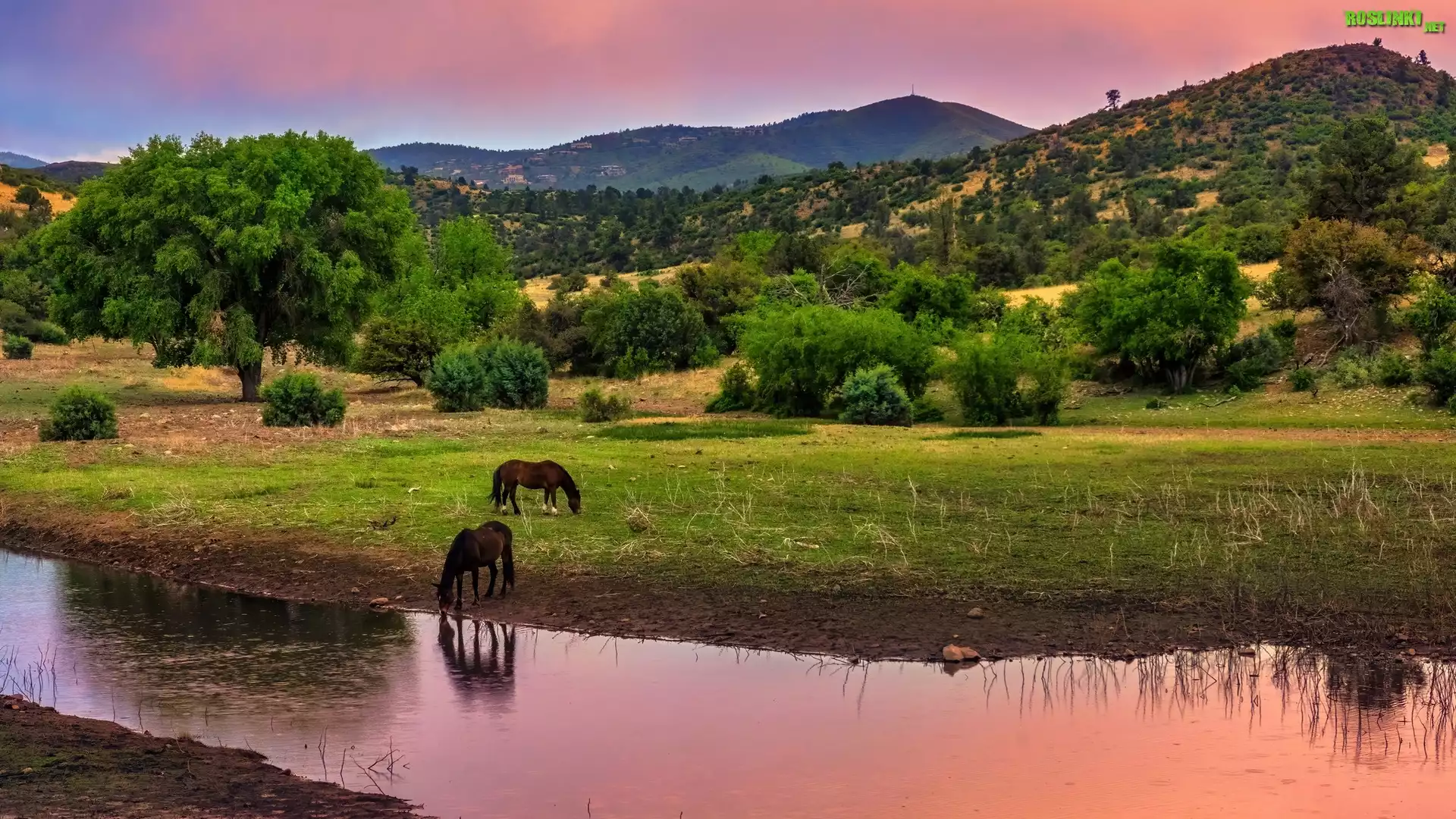 Rośliny: Góry, Rzeka, Polana, Łąka, Drzewa, Konie