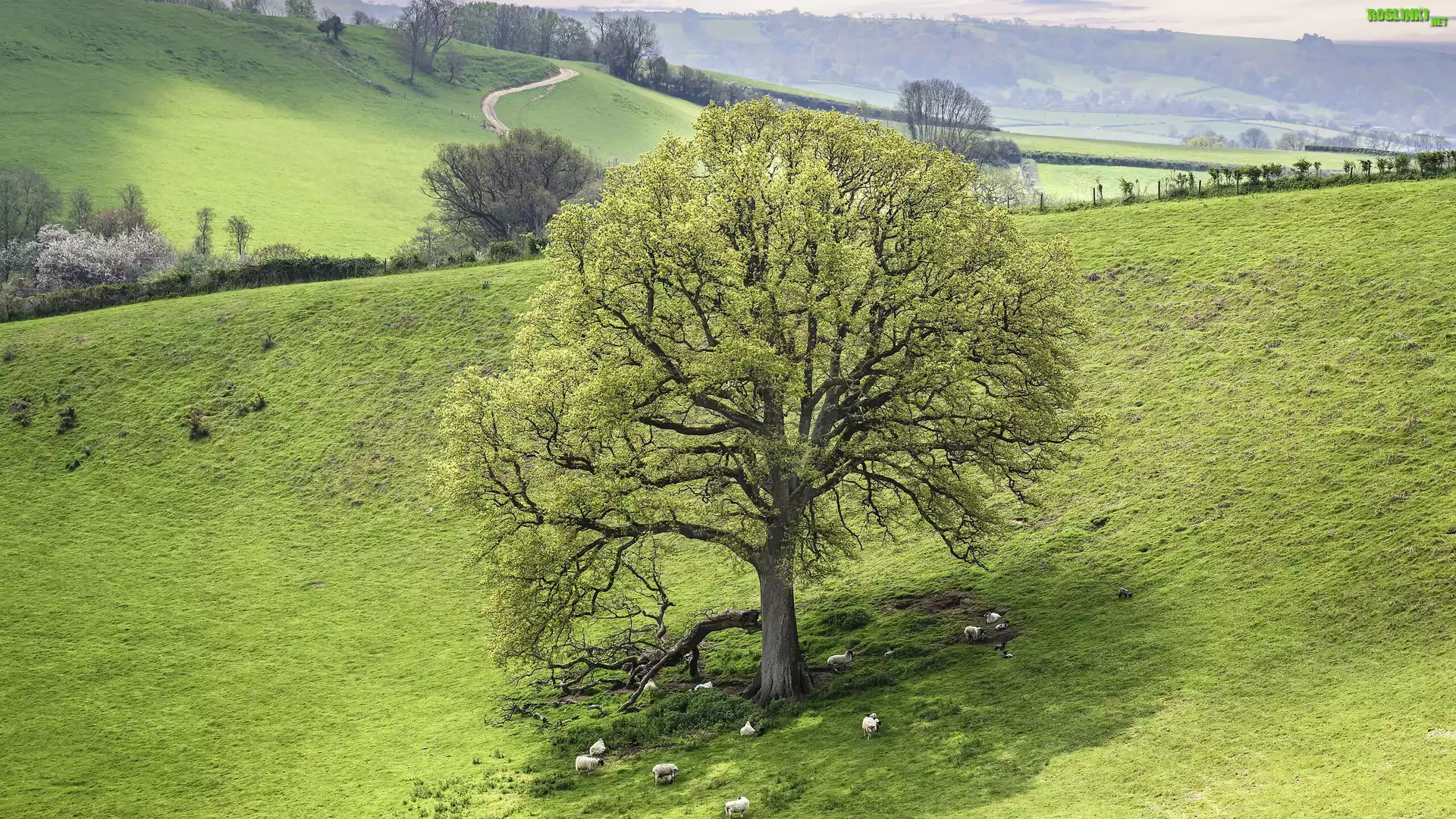 Rośliny: Drzewo, Łąka, Trawa, Owce, Wzgórze