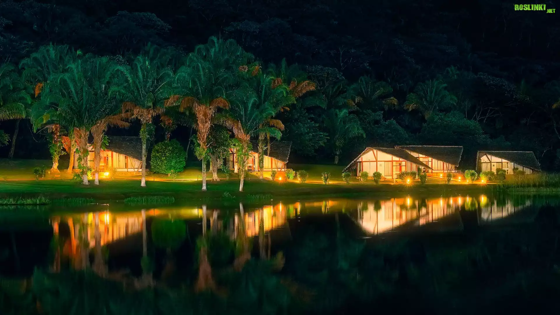 Boliwia, Santa Cruz, Oświetlone, Domki, Palmy, Odbicie, Jezioro, Volcan Lake