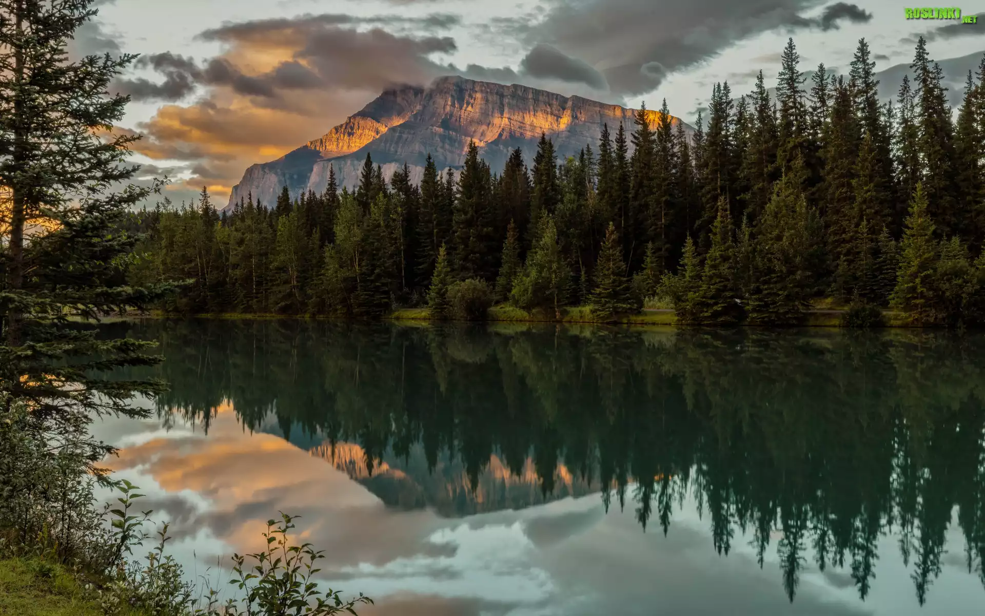 Góry, Góra Mount Rundle, Jezioro, Two Jack Lake, Park Narodowy Banff, Drzewa, Odbicie, Alberta, Kanada |