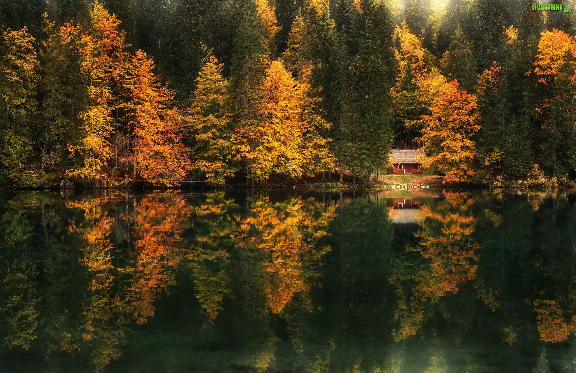 Rośliny: Jezioro Fusine Lake, Jesień, Drzewa, Lasy, Odbicie, Domek, Prowincja Udine, Włochy
