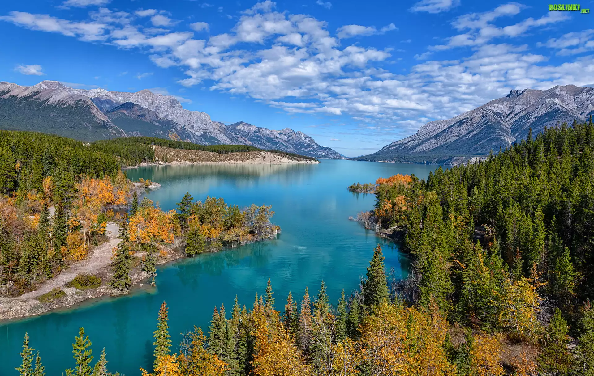 Góry Skaliste, Canadian Rockies, Jezioro, Abraham Lake, Lasy, Drzewa, Alberta, Kanada