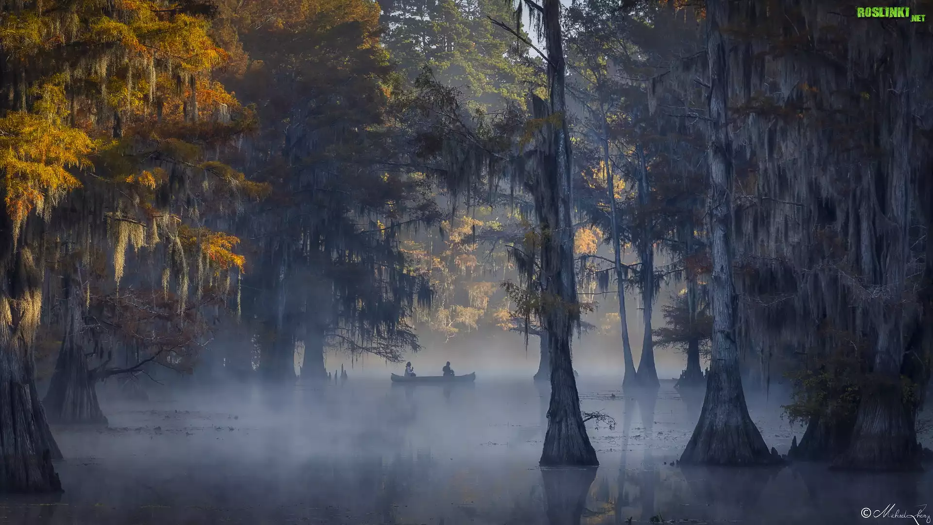 Jezioro, Caddo Lake, Drzewa, Mgła, Kajak, Karnack, Stan Teksas, Stany Zjednoczone