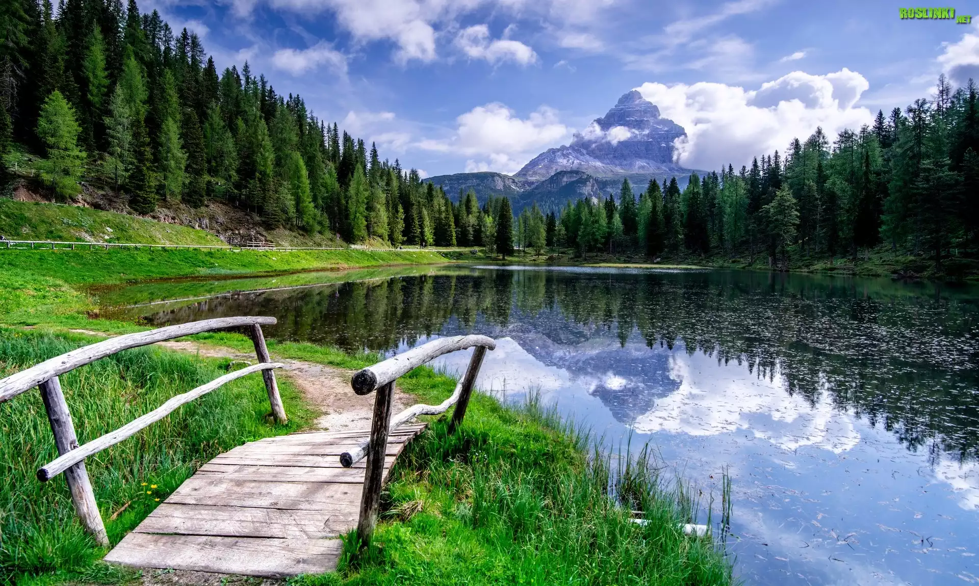 Rośliny: Góry, Dolomity, Las, Drzewa, Jezioro, Antorno Lake, Mostek, Trawa, Chmury, Włochy