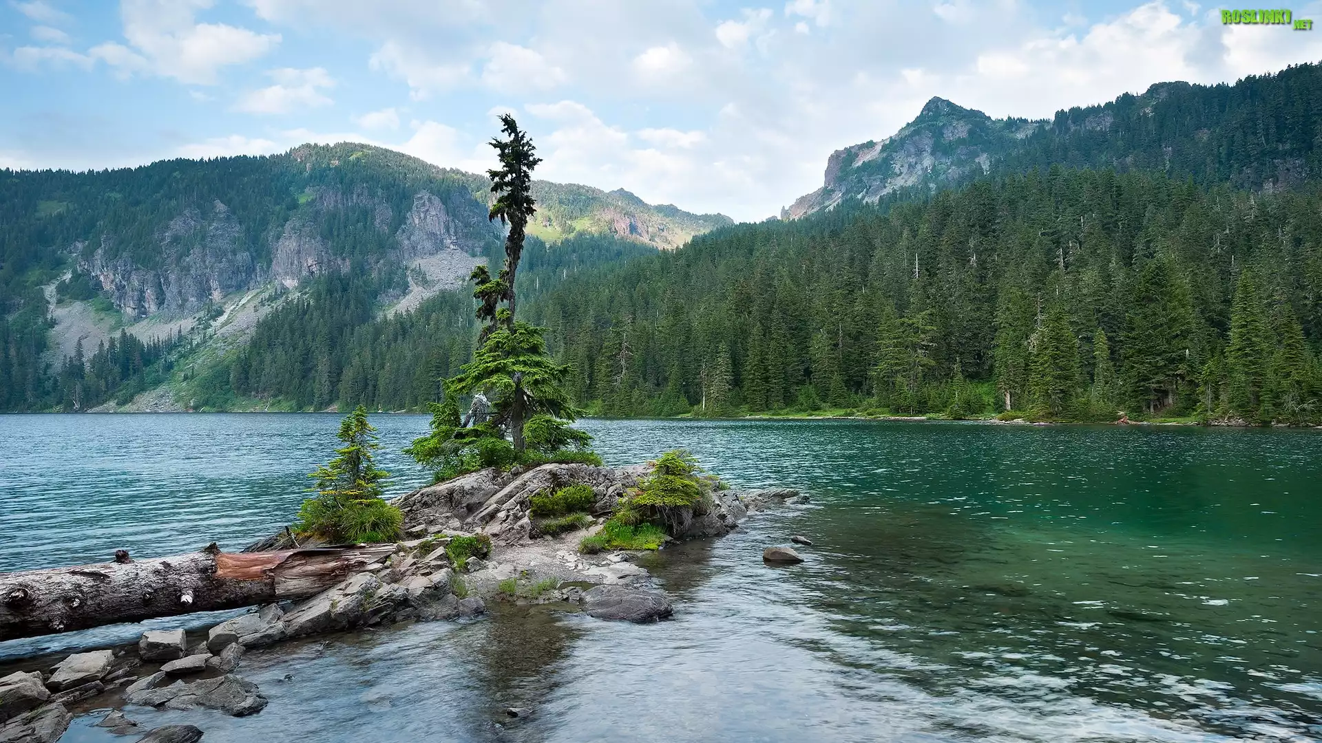 Rośliny: Góry, Jezioro, Mowich Lake, Drzewa, Park Narodowy Mount Rainier, Stan Waszyngton, Stany Zjednoczone