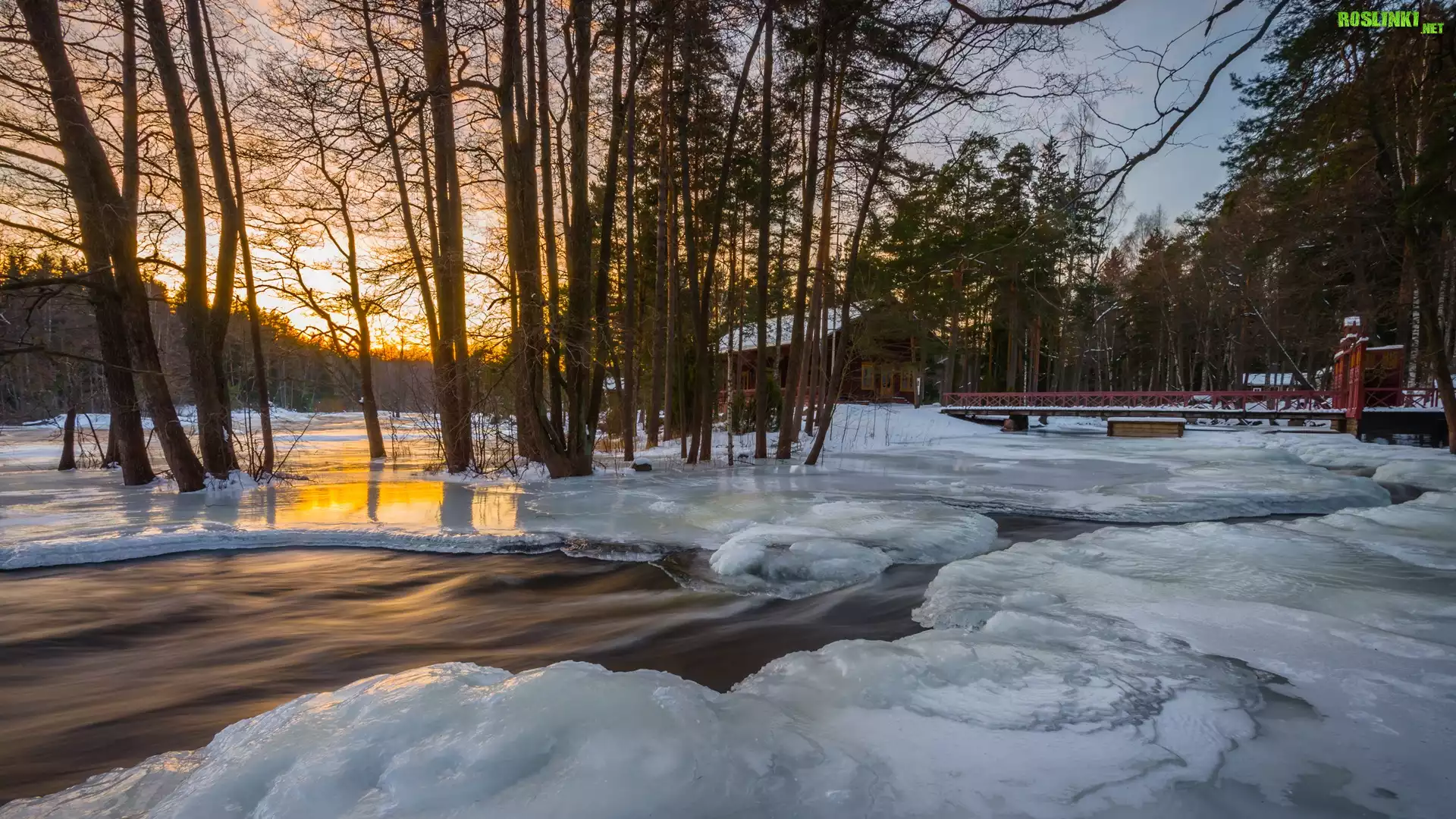 Rośliny: Zima, Rzeka Langinkoski, Lód, Drzewa, Mostek, Dom, Wschód słońca, Kotka, Finlandia