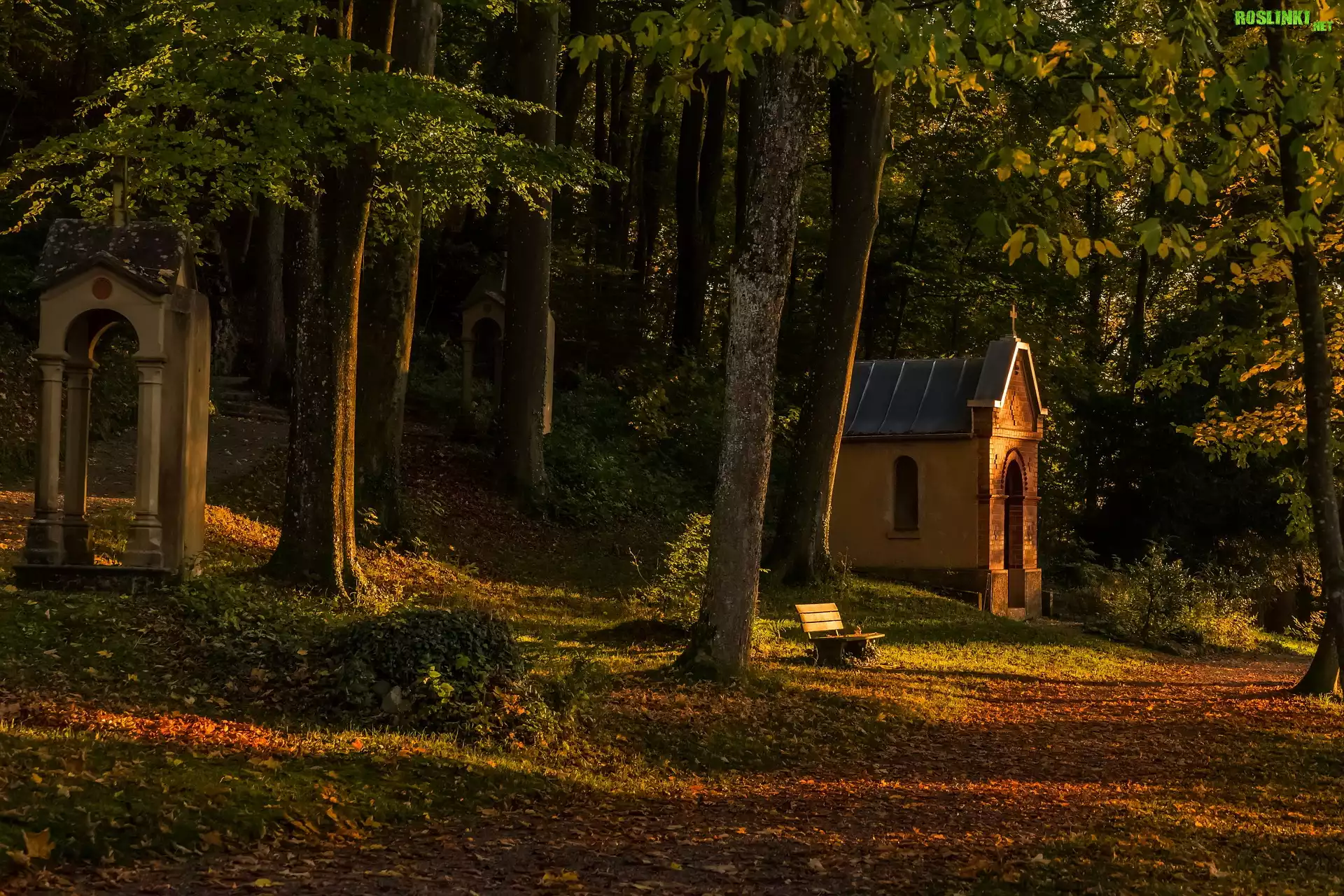 Rośliny: Las, Drzewa, Ławeczka, Kaplica