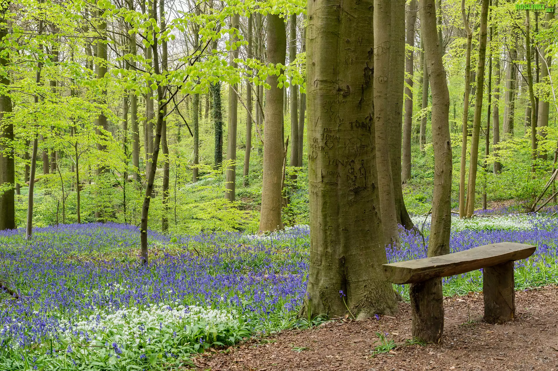 Rośliny: Las, Drzewa, Kwiaty, Ścieżka, Ławka, Wiosna