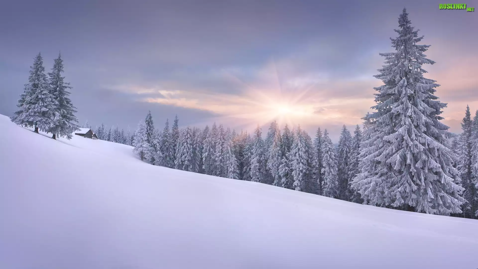 Rośliny: Zima, Las, Świerki, Wschód słońca, Chmury, Mgła, Dom