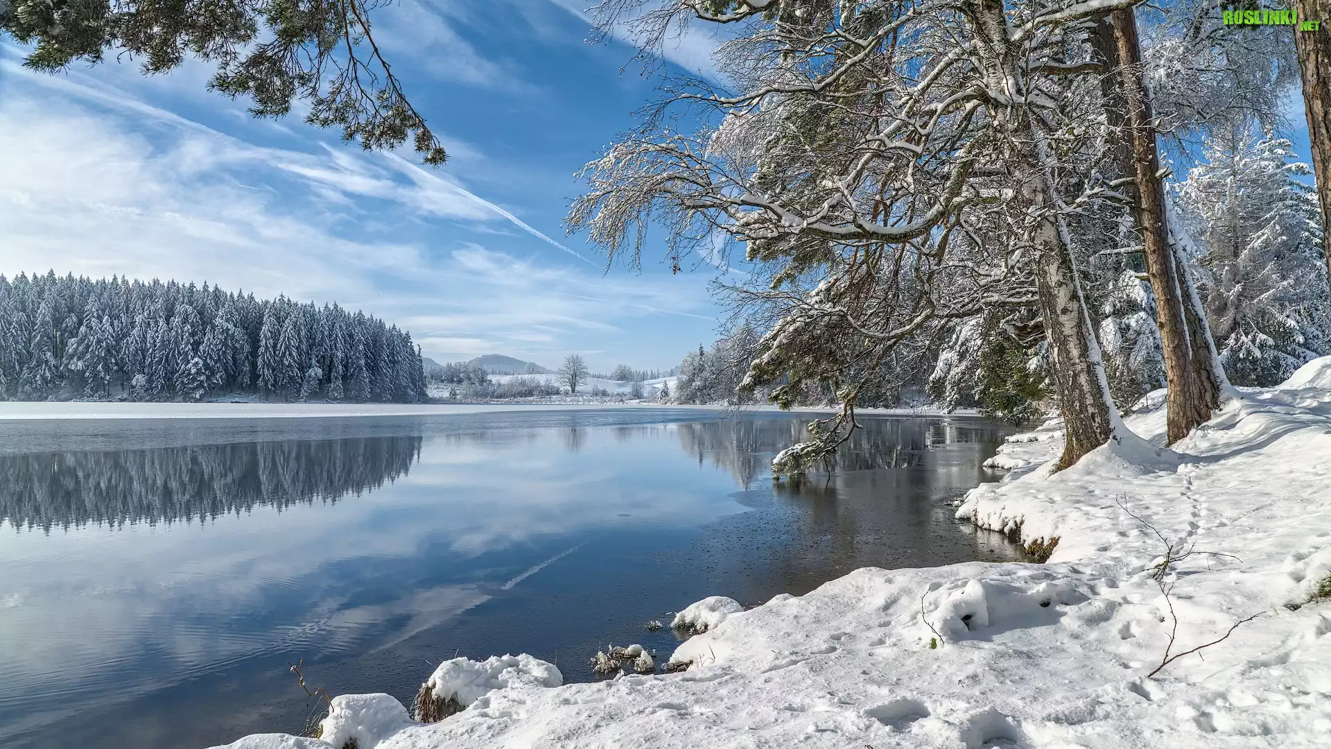 Rośliny: Zima, Jezioro, Drzewa, Las, Śnieg, Niebo, Chmury