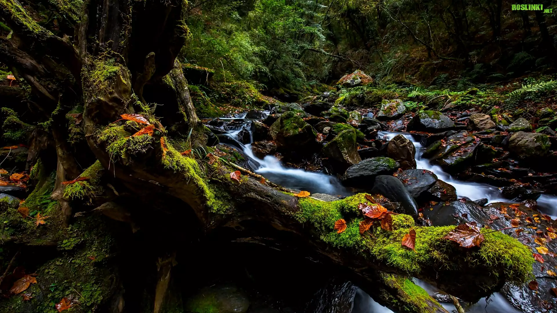Rośliny: Las, Rzeka, Kamienie, Omszałe, Drzewa, Liście