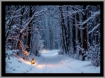 Zima, Las, Drzewa, Åšnieg, Lampy