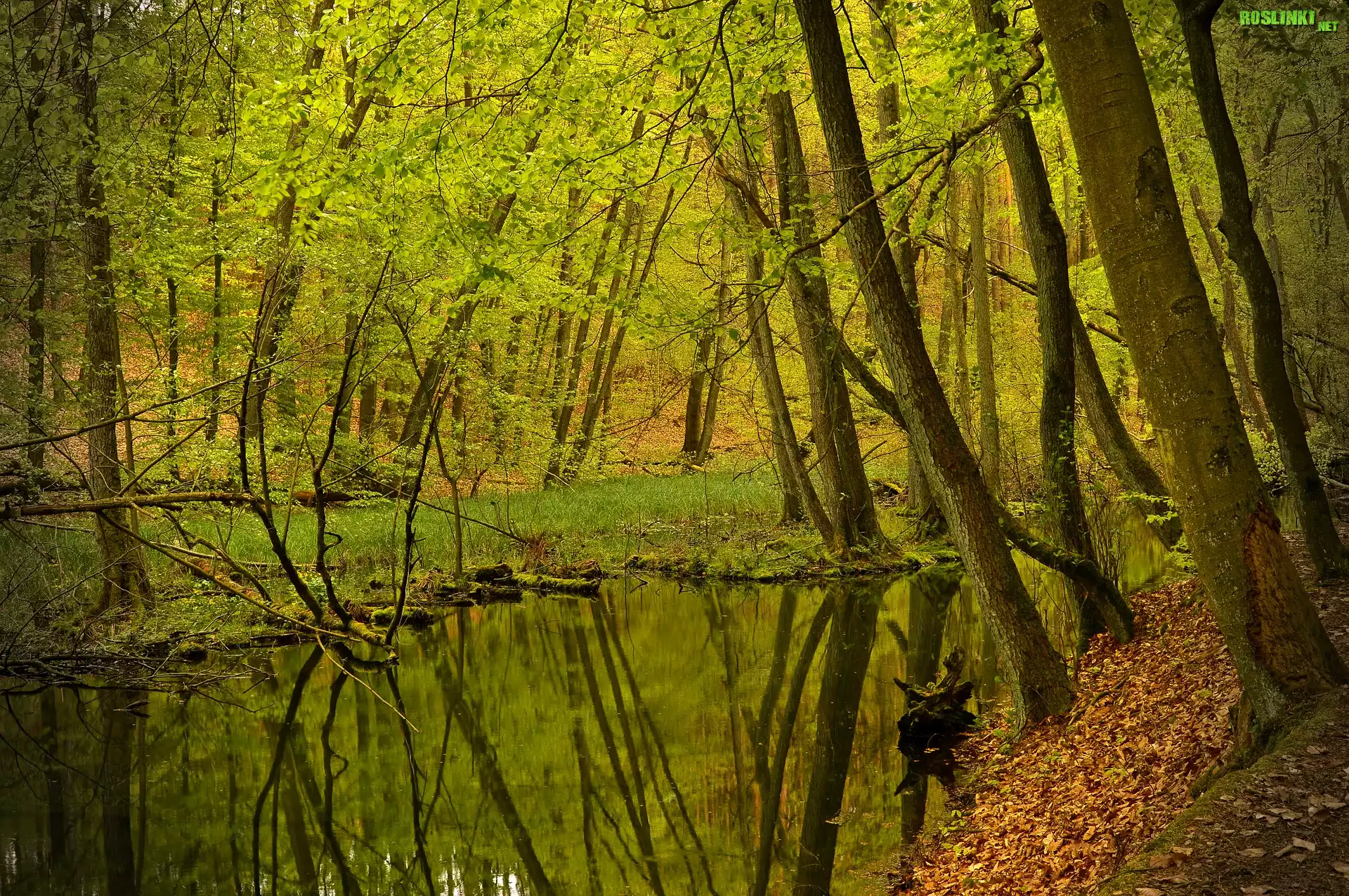 Rośliny: Las, Opadłe, Liście, Drzewa, Staw