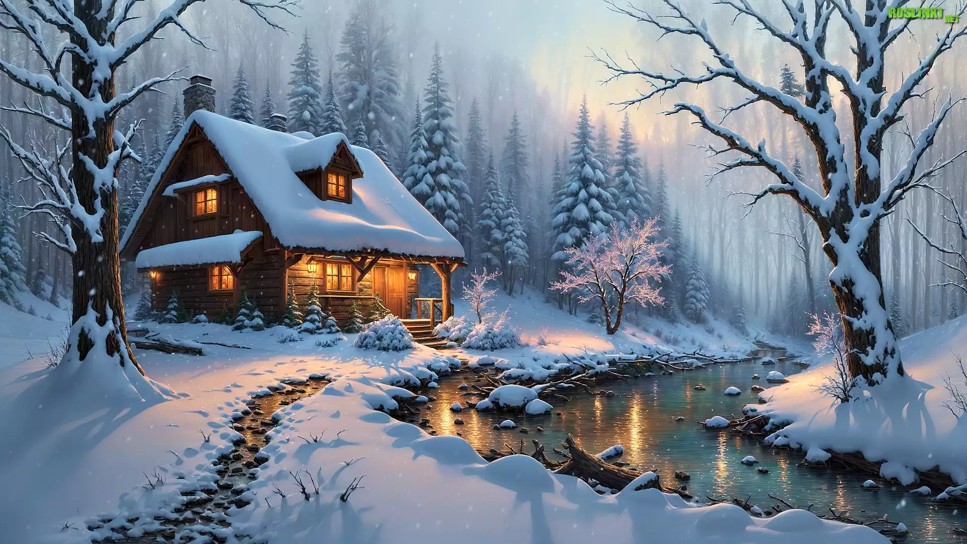 Zima, Dom, Rzeka, Las, Grafika, Drzewa