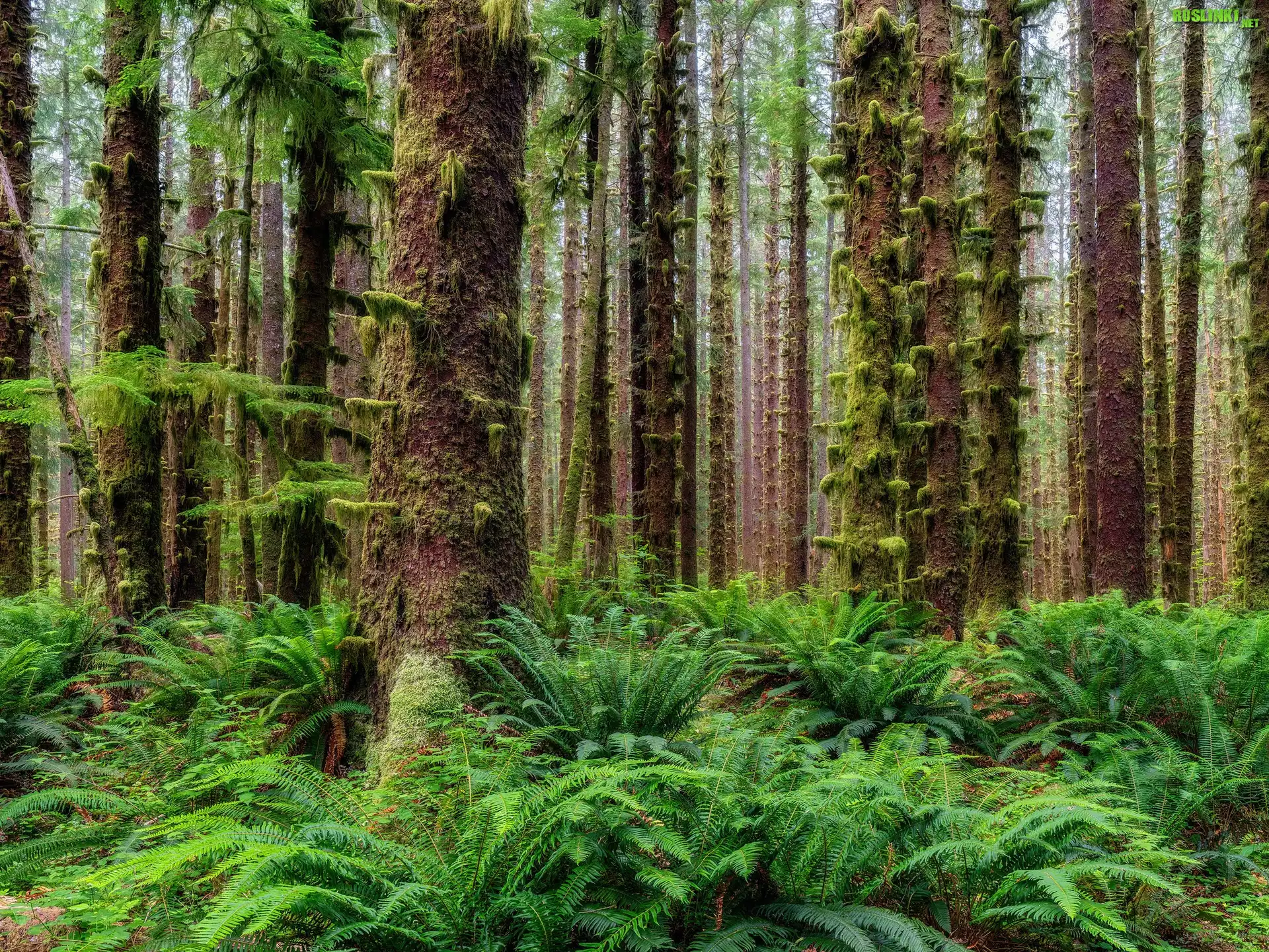 Rośliny: Stany Zjednoczone, Waszyngton, Park Narodowy Olympic, Las, Drzewa, Omszone, Pnie, Paprocie