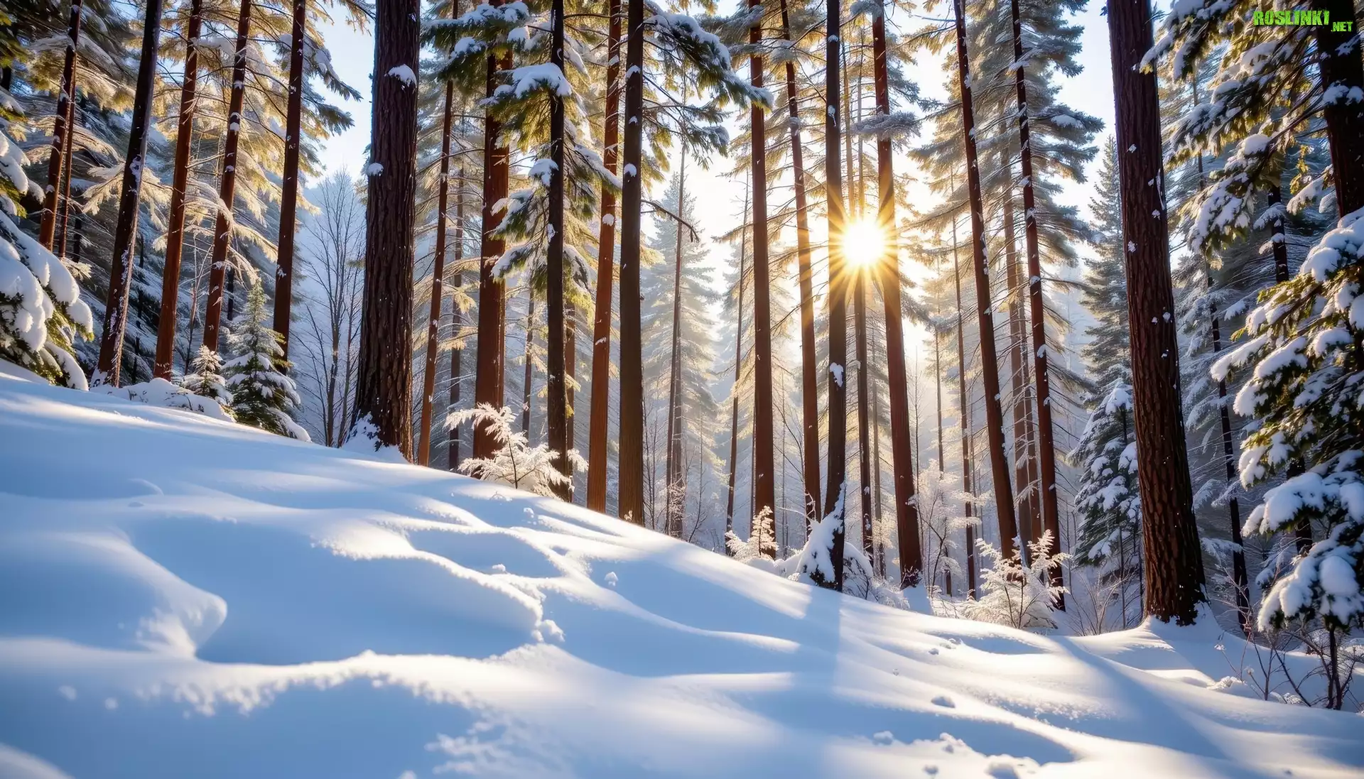 Rośliny: Zima, Zbocze, Drzewa, Las, Słońce, Grafika AI