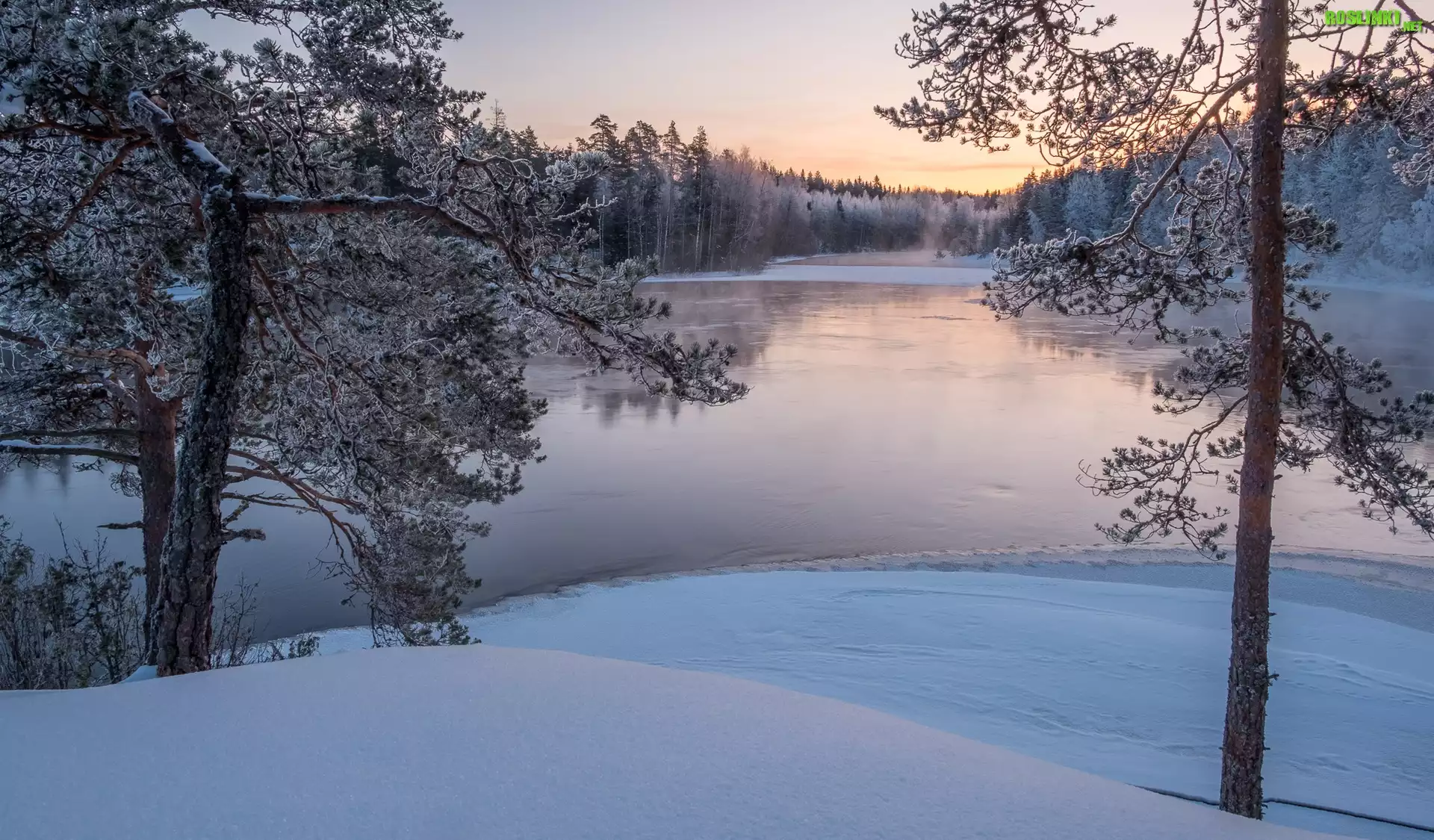 Rośliny: Zima, Rzeka Kymijoki, Las, Drzewa, Finlandia