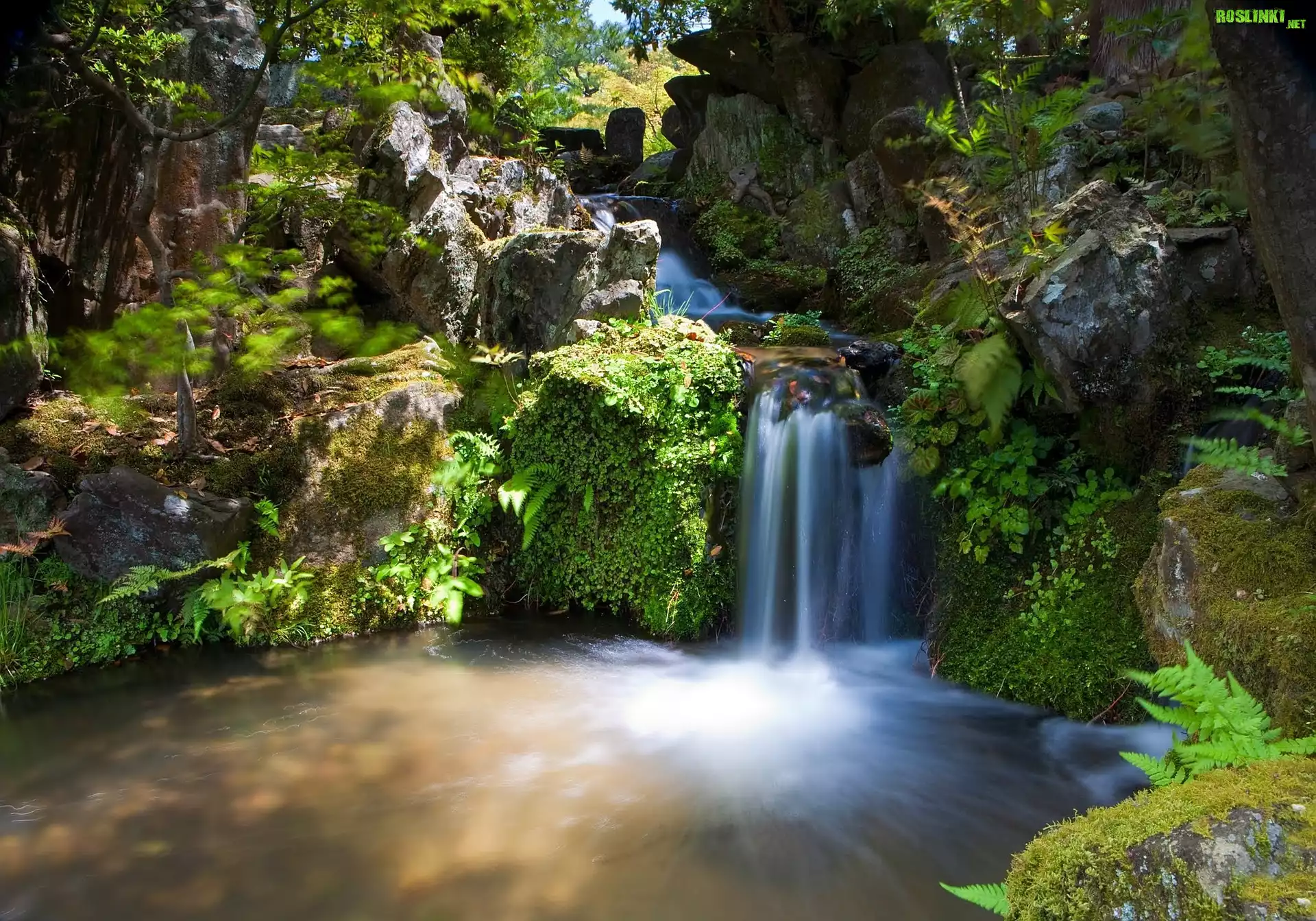Rośliny: Las, Wodospad, Głazy, Paprocie