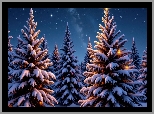 Las, Drzewa, Choinki, Światełka, Zima, Niebo, Gwiazdy, Grafika AI