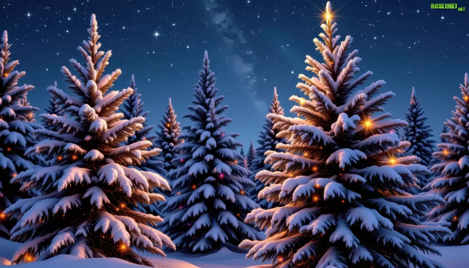 Rośliny: Las, Drzewa, Choinki, Światełka, Zima, Niebo, Gwiazdy, Grafika AI