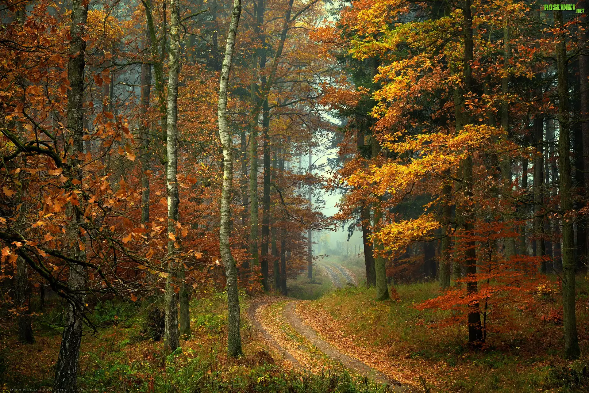Rośliny: Las, Drzewa, Ścieżka, Liście, Jesień, Mgła