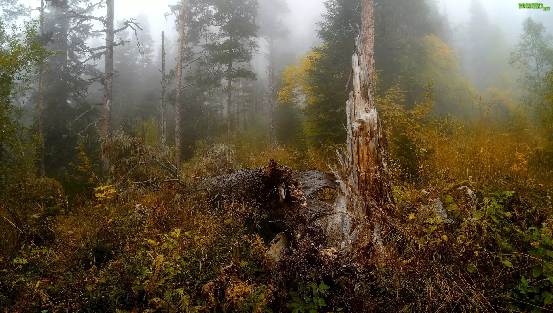 Jesień, Las, Drzewa, Mgła, Rośliny, Powalone, Drzewo