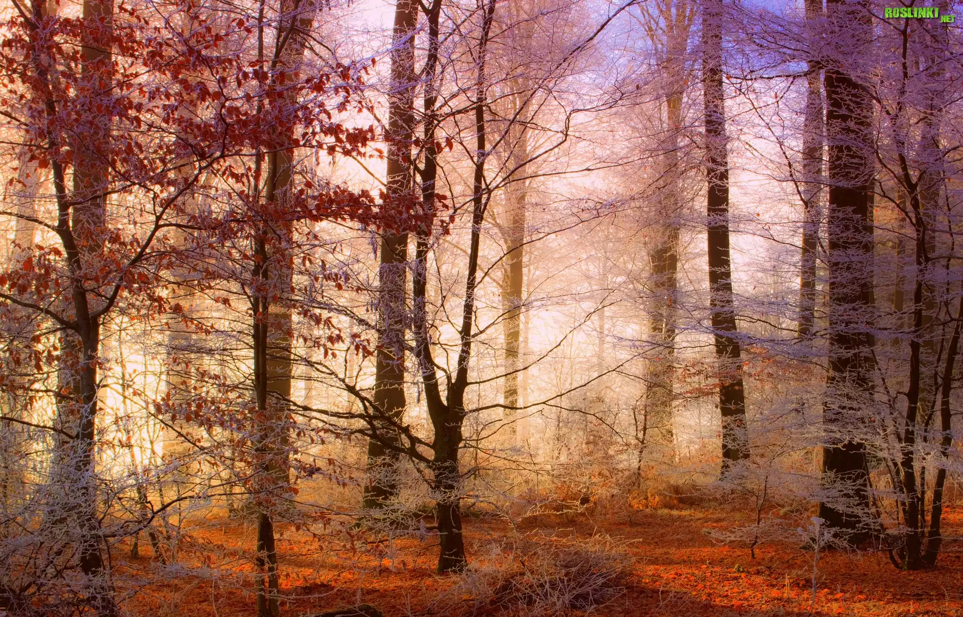 Rośliny: Jesień, Las, Drzewa, Mgła, Szron, Opadłe, Liście