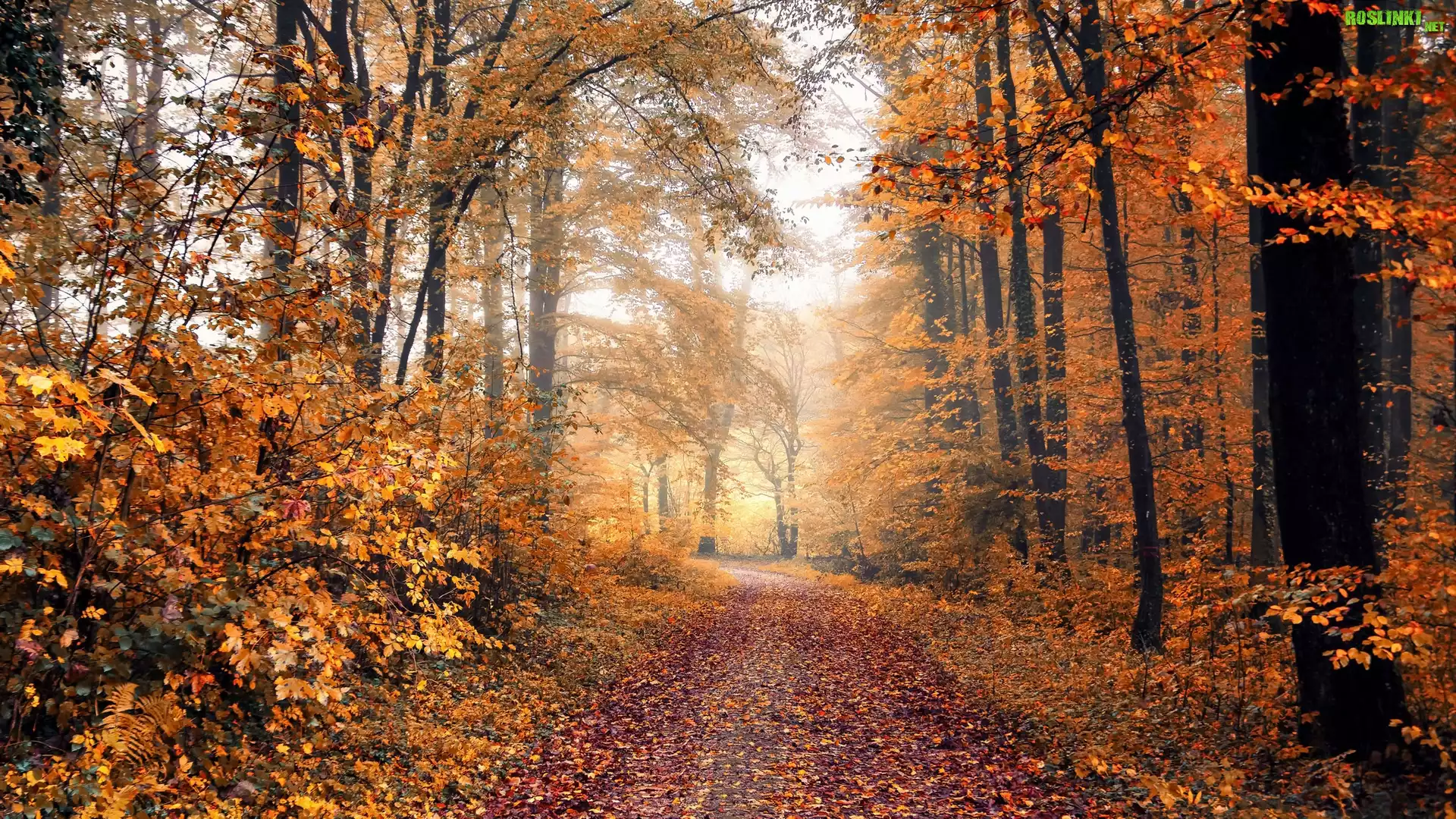 Rośliny: Jesień, Las, Drzewa, Droga, Opadłe, Liście, Mgła