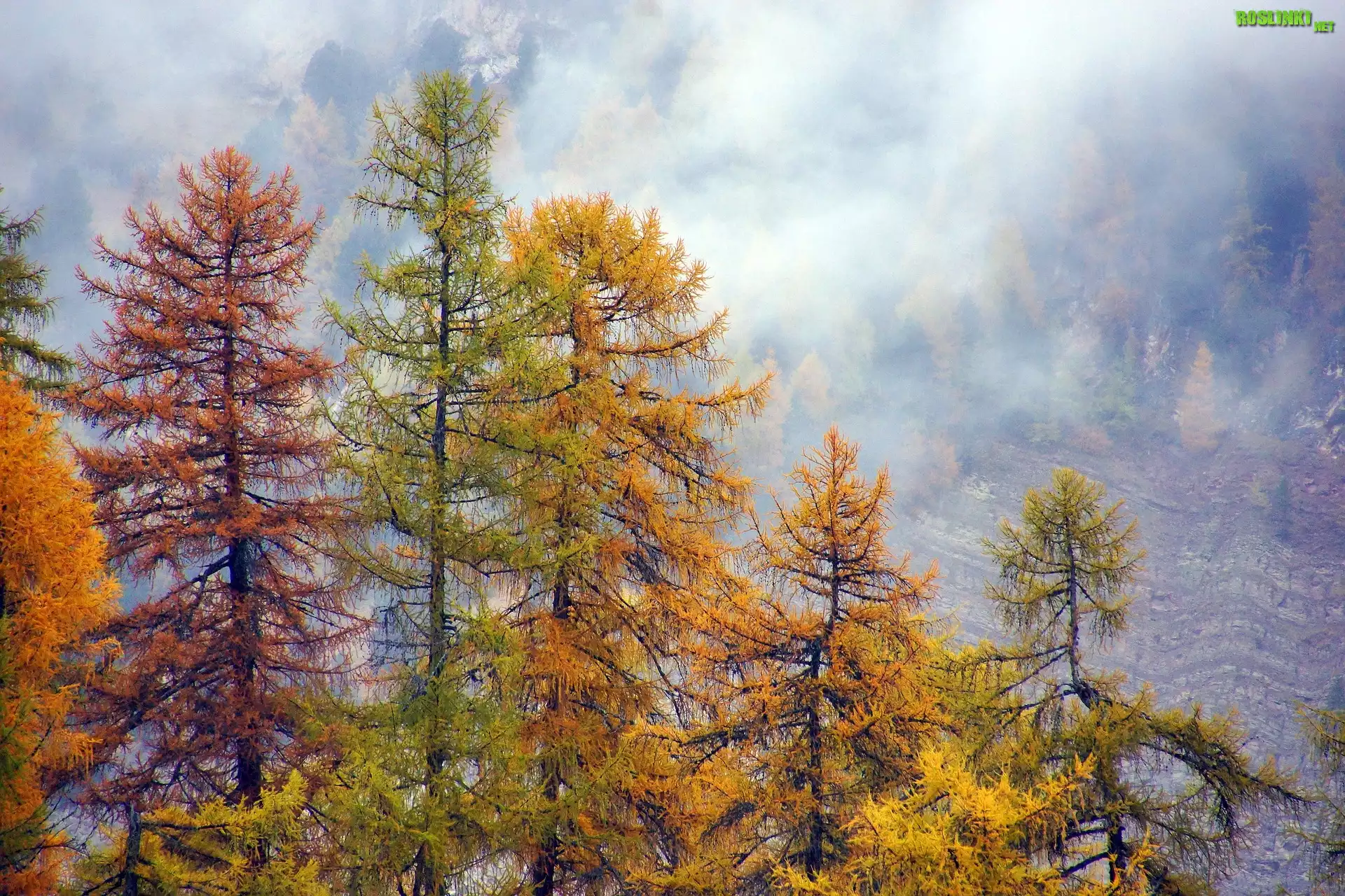 Rośliny: Las, Drzewa, Modrzewie, Jesień, Mgła