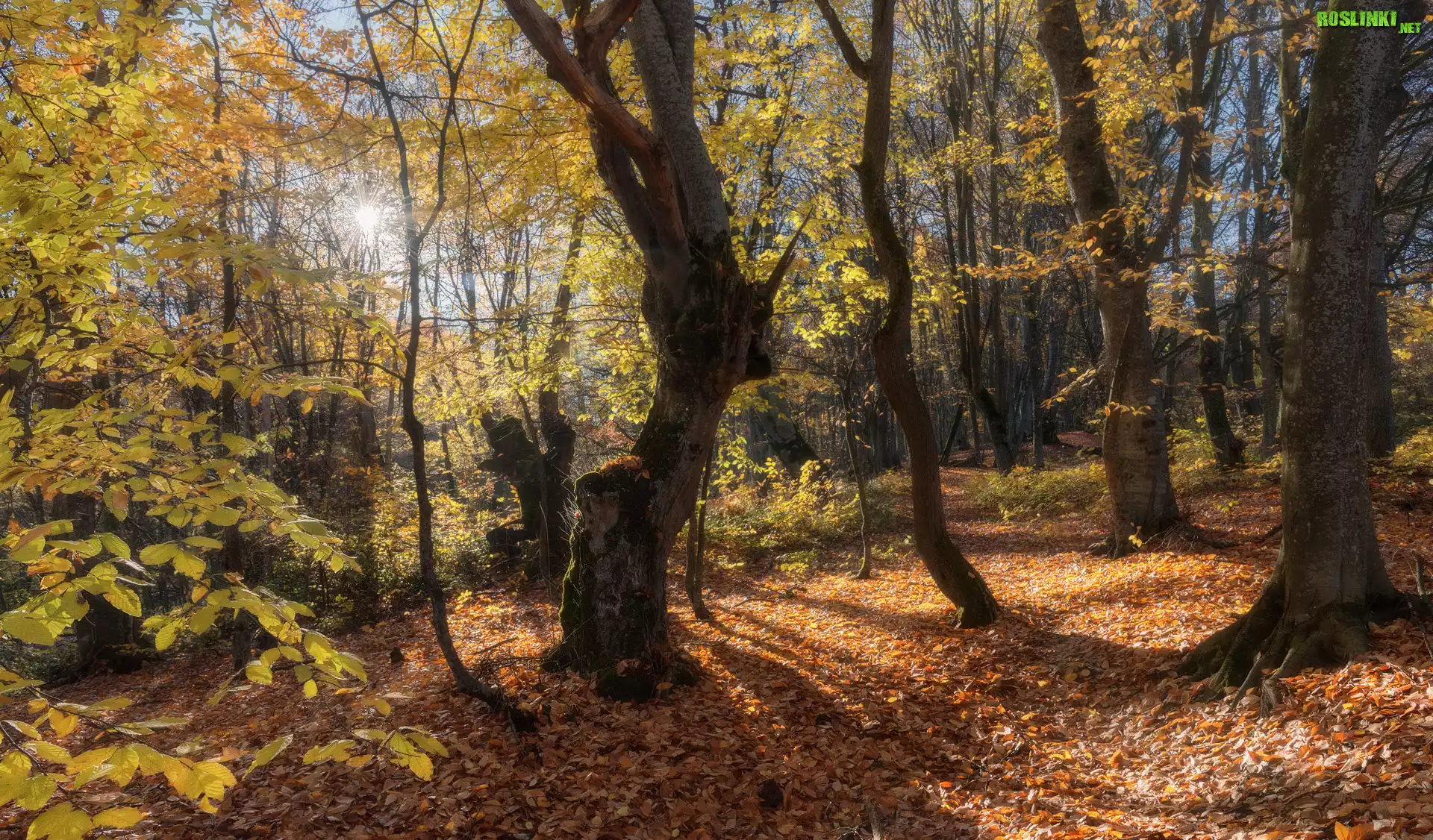 Rośliny: Jesień, Las, Drzewa, Promienie słońca, Liście, Opadłe