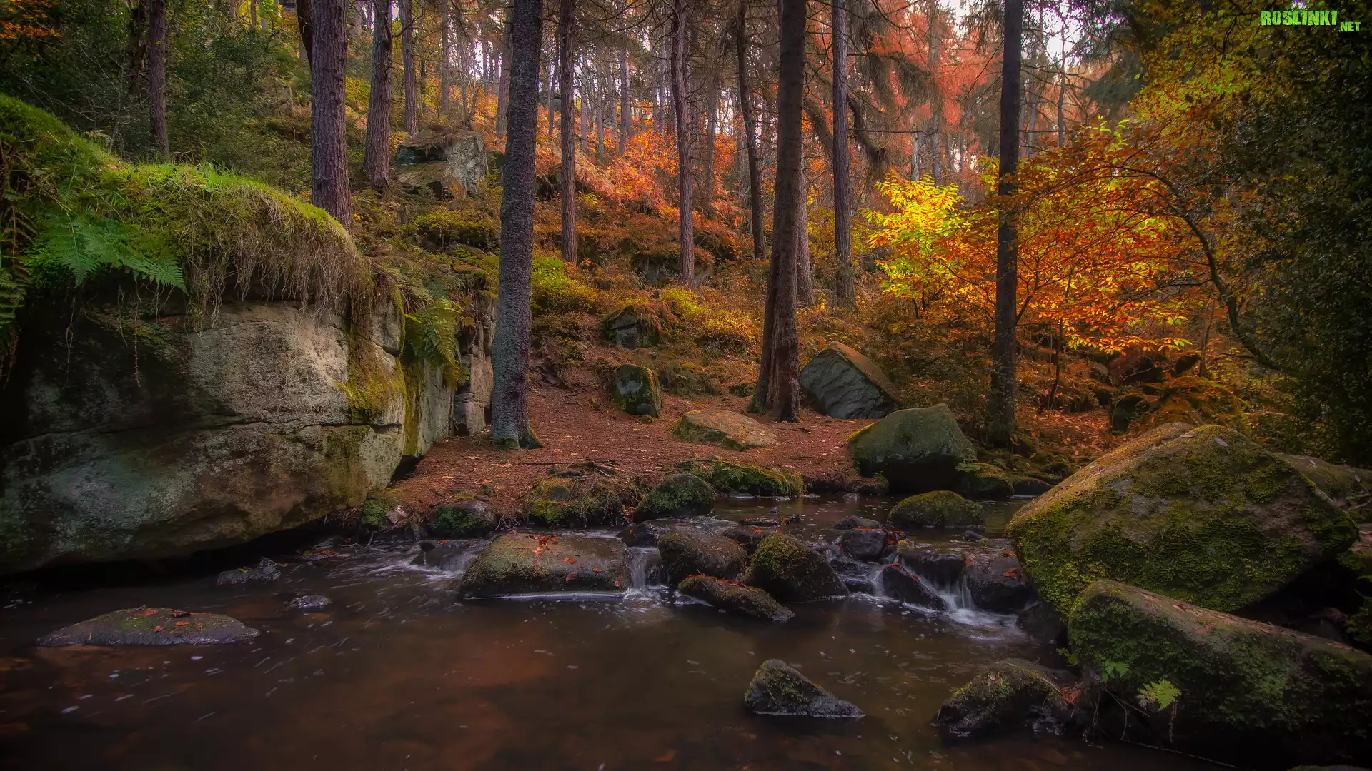 Rośliny: Jesień, Las, Drzewa, Kamienie, Omszona, Skała, Rzeczka