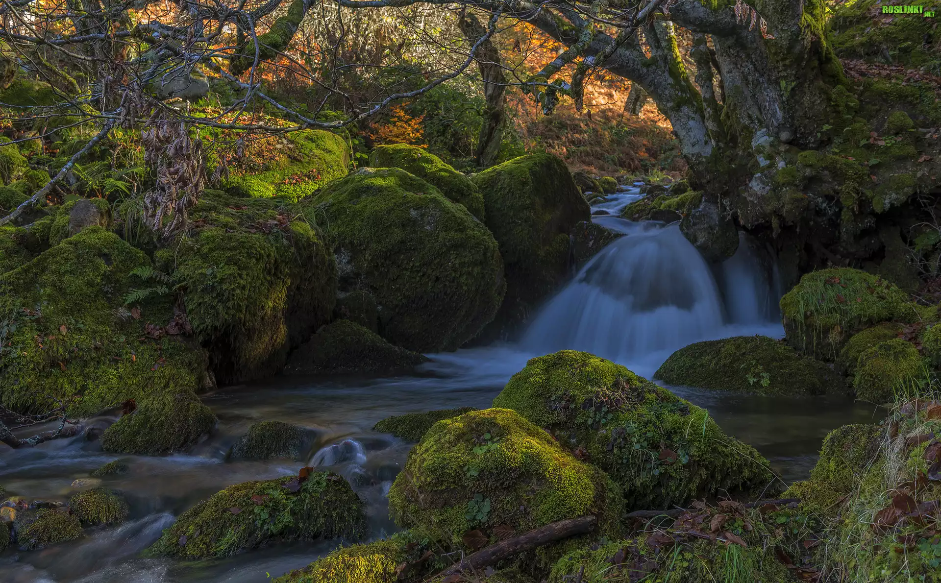 Rośliny: Las, Drzewa, Omszałe, Kamienie, Rzeka