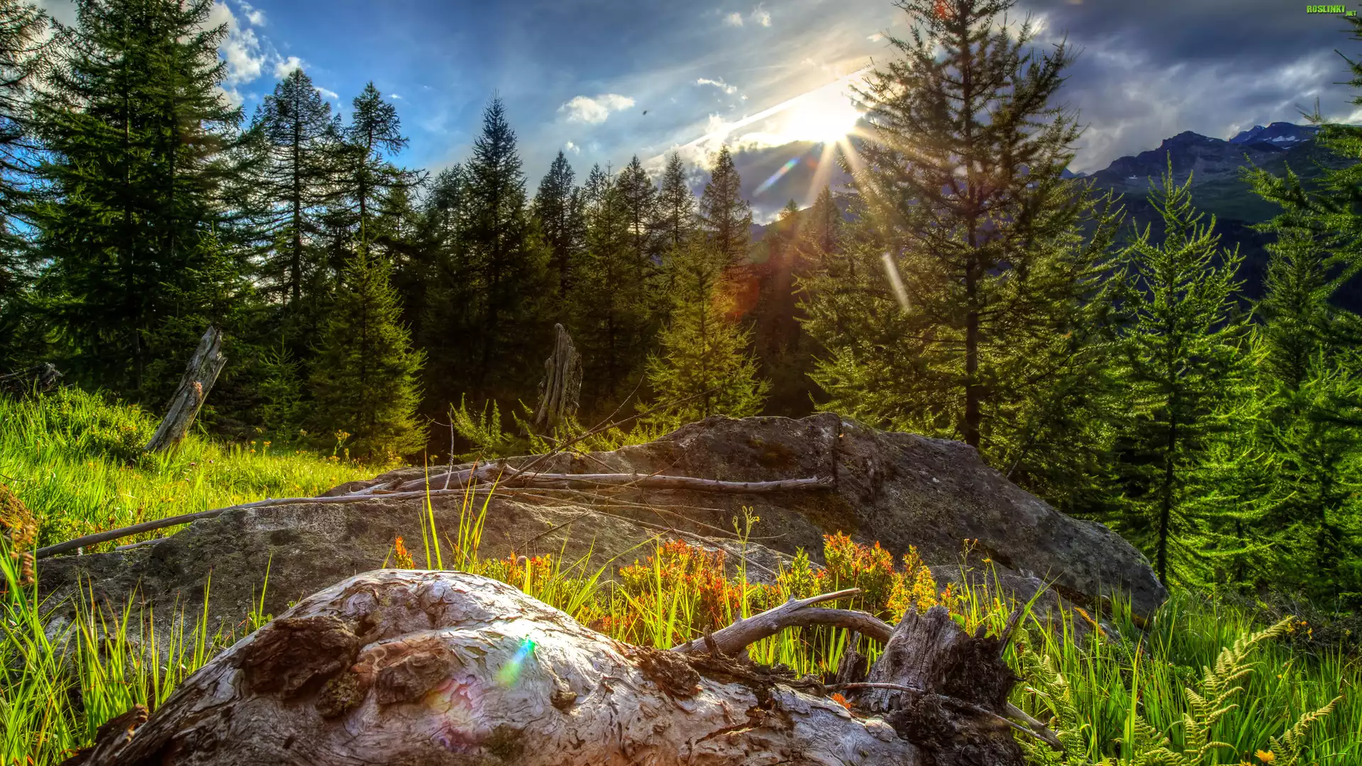 Rośliny: Las, Góry, Promienie słońca, Kamienie, Drzewa