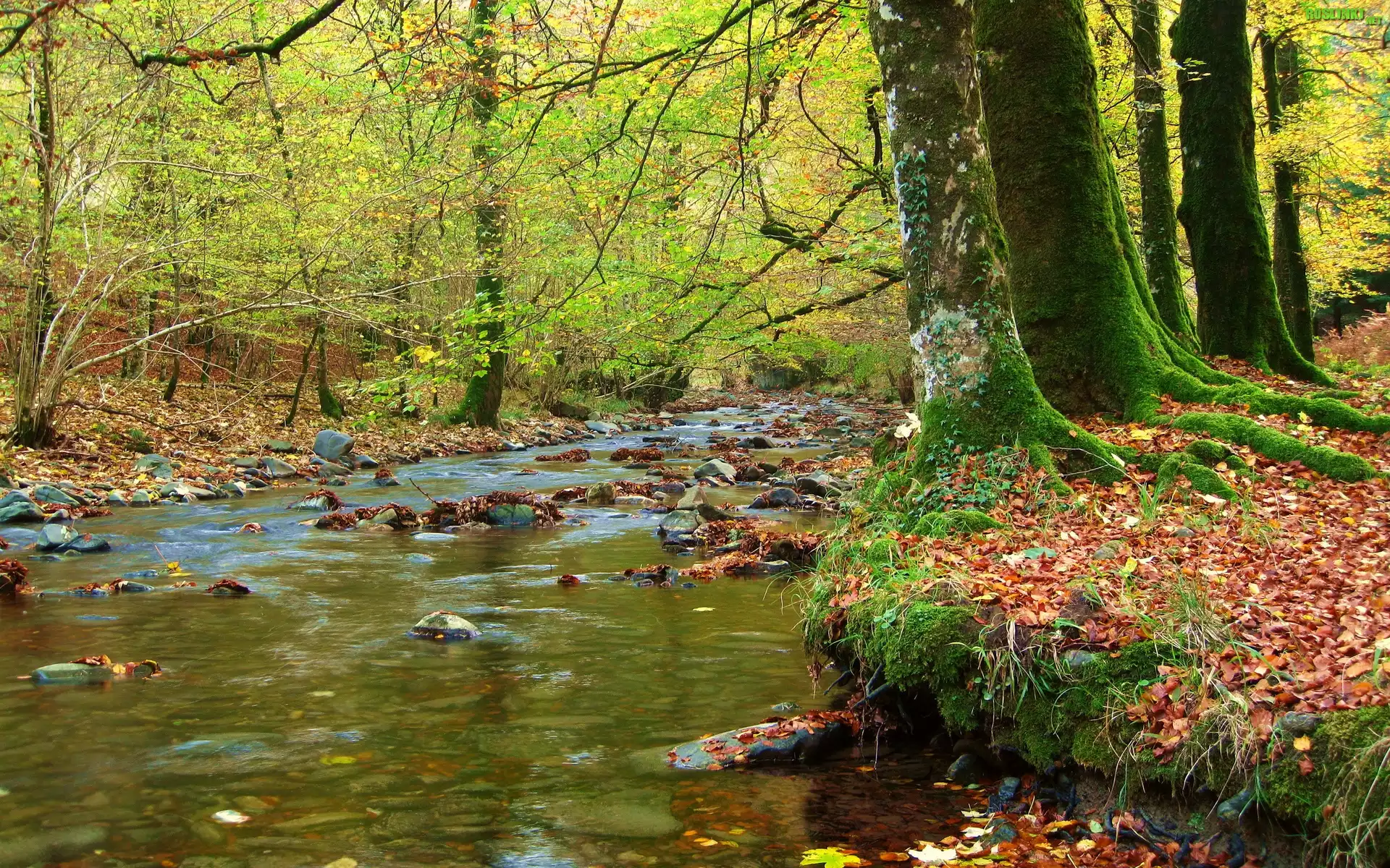 Rośliny: Las, Rzeczka, Kamienie, Drzewa