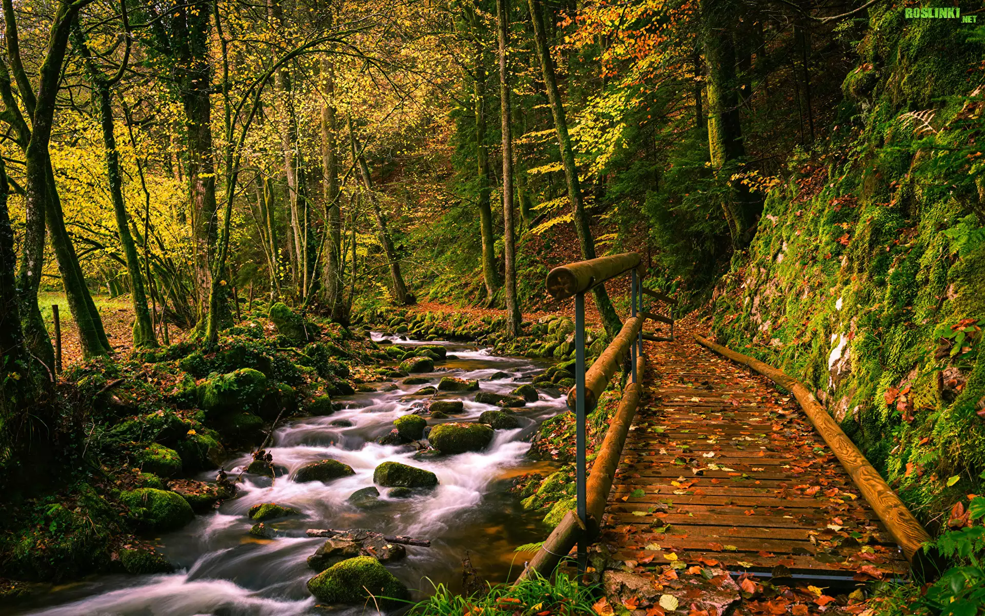 Rośliny: Las, Drzewa, Rzeczka, Potok, Kamienie, Pomost