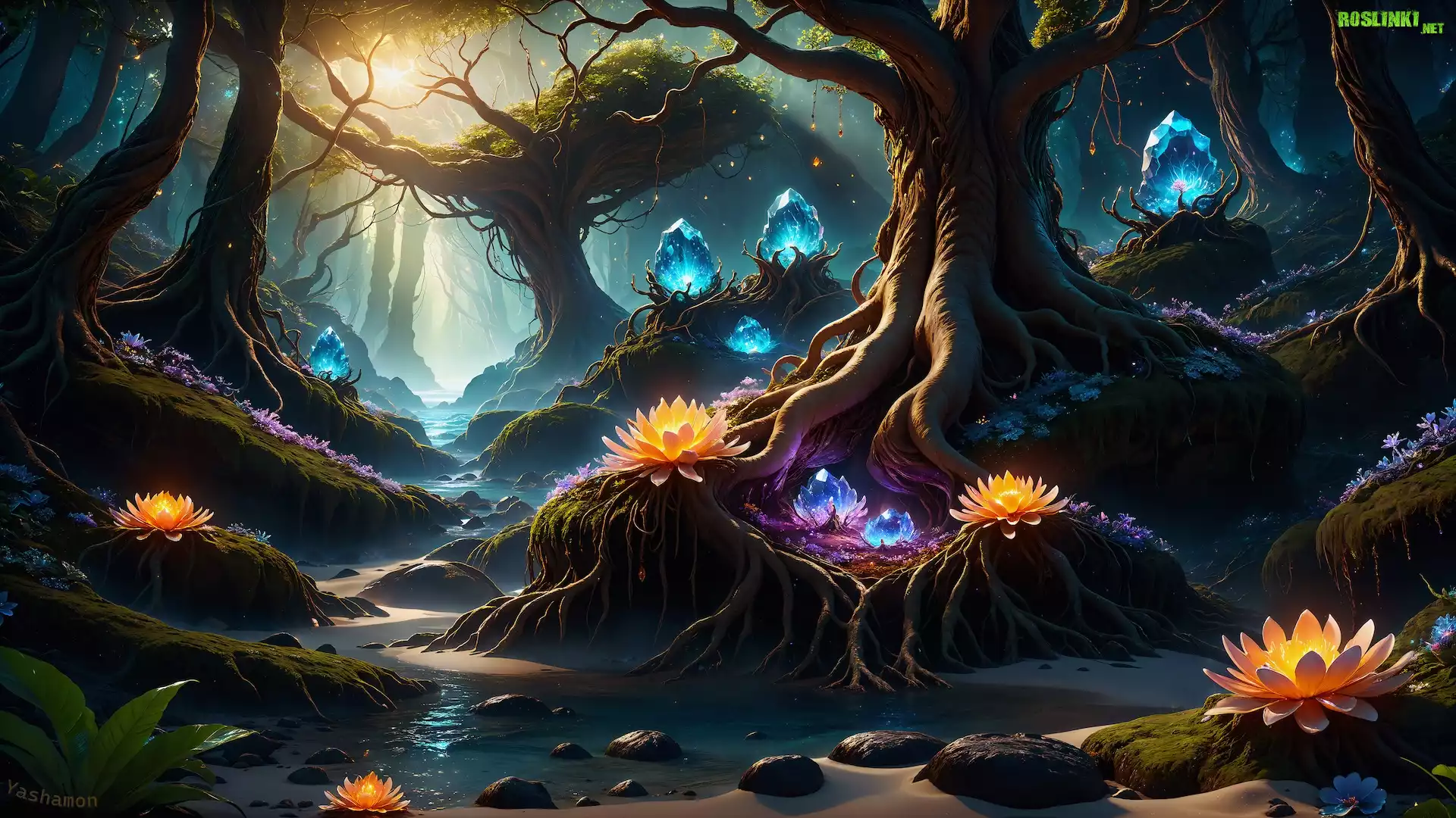 Rośliny: Grafika, Drzewa, Kwiaty, Lilie wodne, Przebijające światło, Las